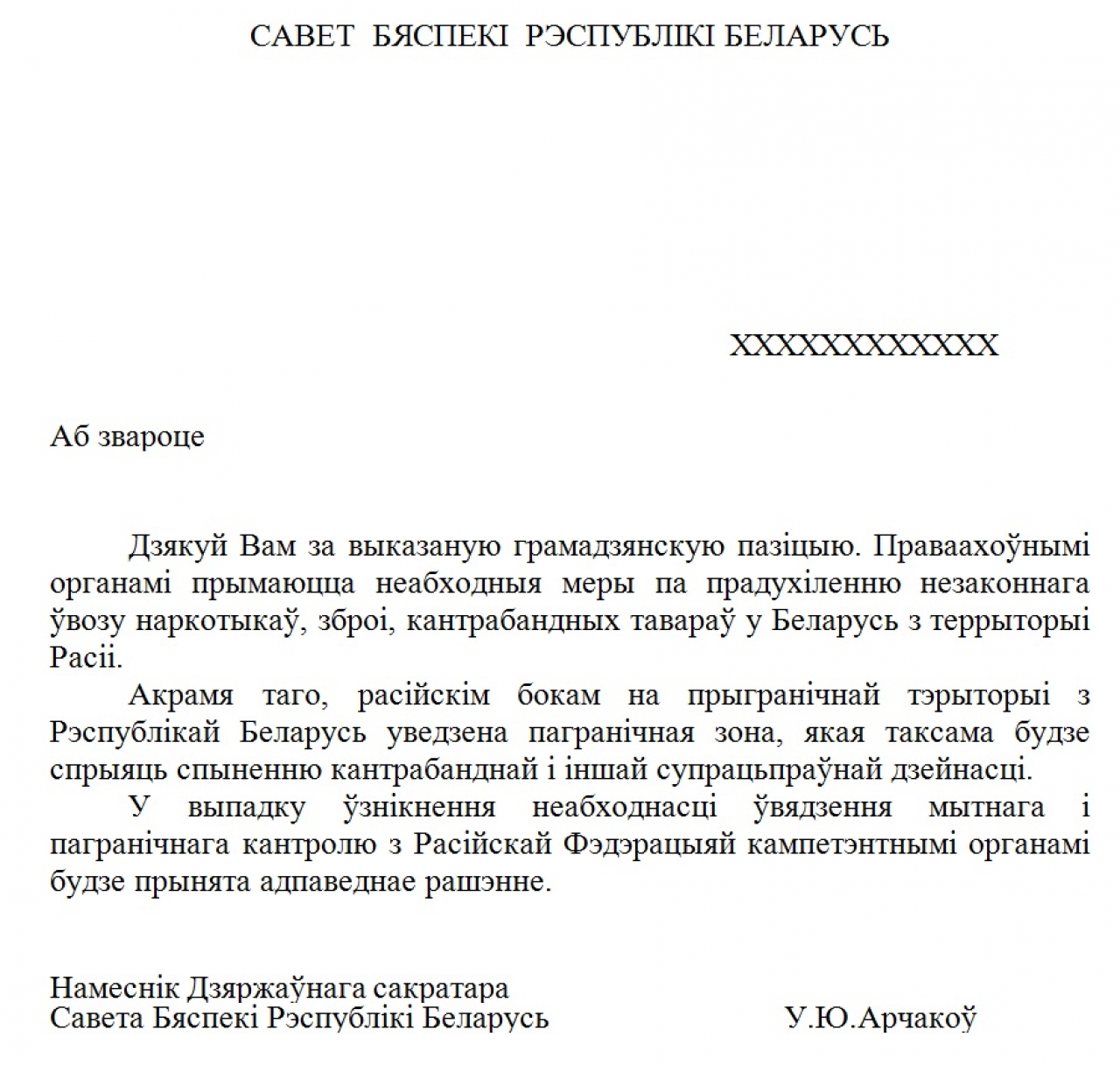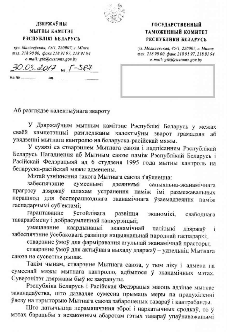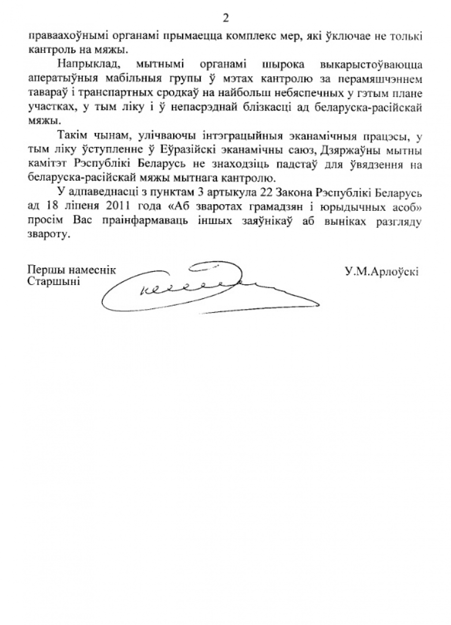 У сувязі з гэтым мы, ніжэйпадпісаныя грамадзяне Рэспублікі Беларусі, патрабуем распрацоўкі захадаў для ўвядзення і ажыццяўлення сталага мытнага і памежнага кантролю на мяжы нашай дзяржавы з Расейскай Федэрацыяй!