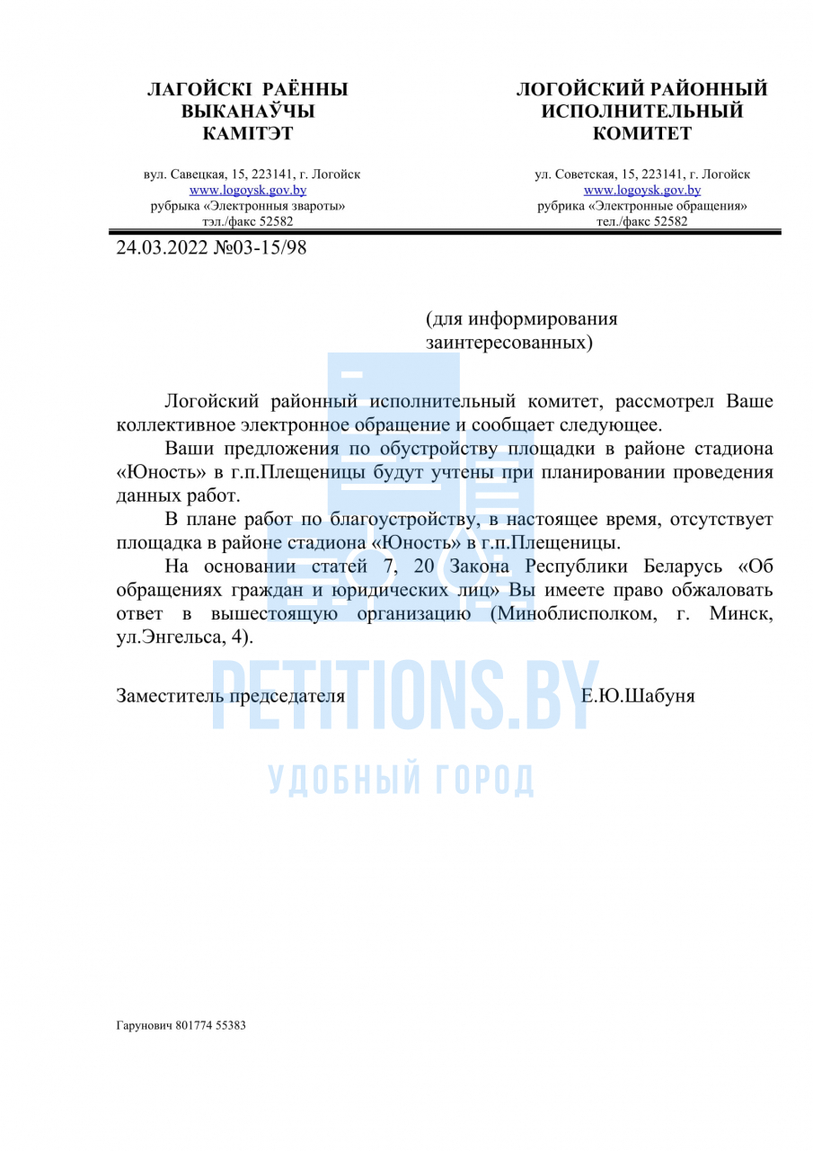 Таким образом, просим в ходе обустройства в районе стадиона «Юность» в г.п. Плещеницы вместо общевойсковой полосы препятствий оборудовать современную площадку для занятия воркаутом, установить уличные тренажеры и площадку для занятия игровыми видами спорта.