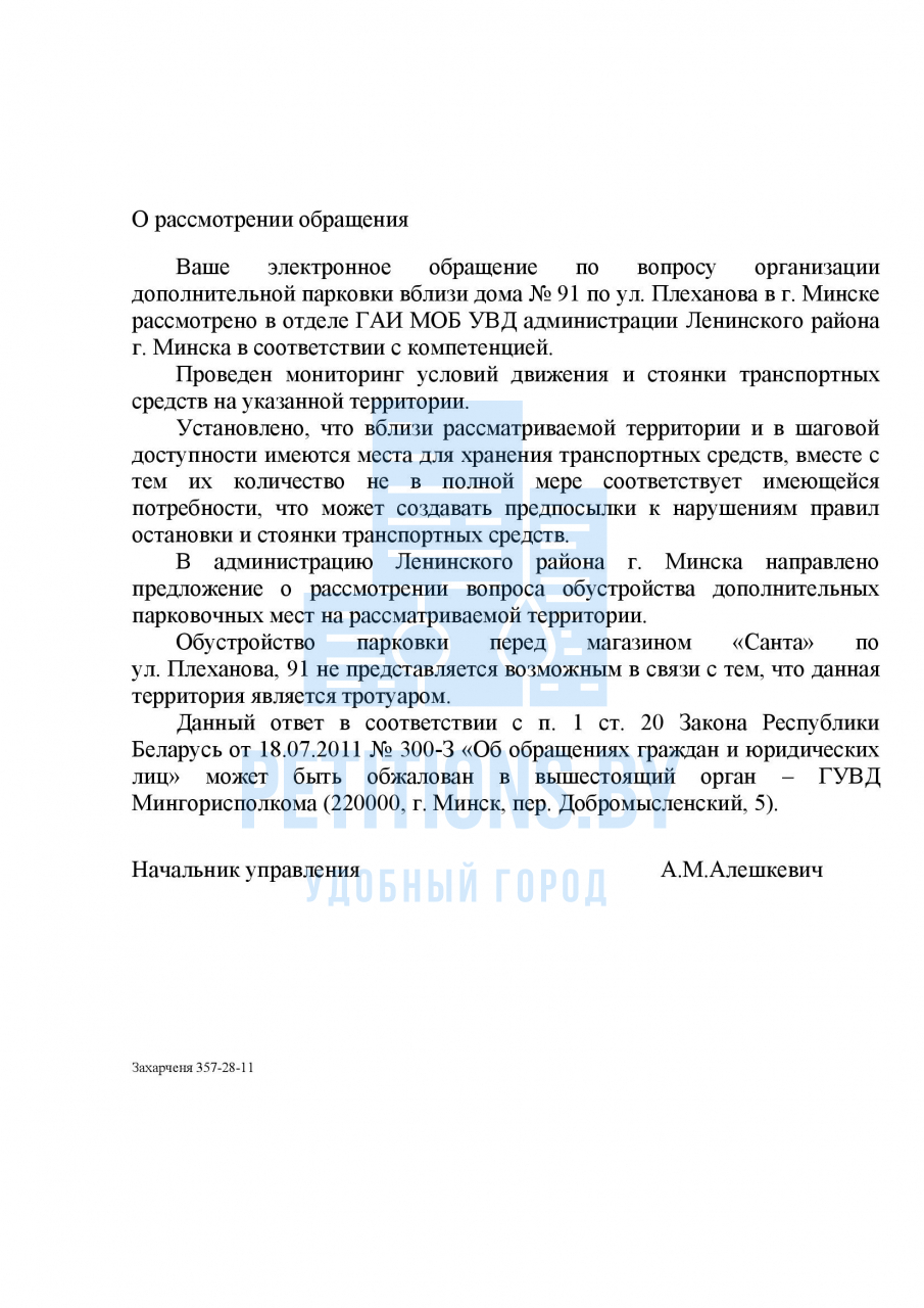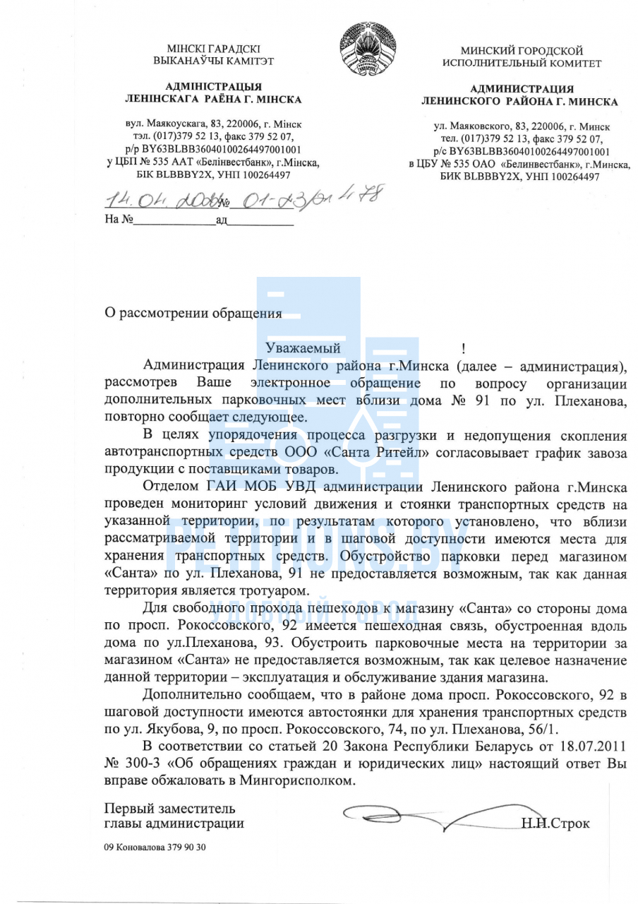 - В администрацию Ленинского района г. Минска направлено предложение о рассмотрении вопроса обустройства дополнительных парковочных мест на рассматриваемой территории.