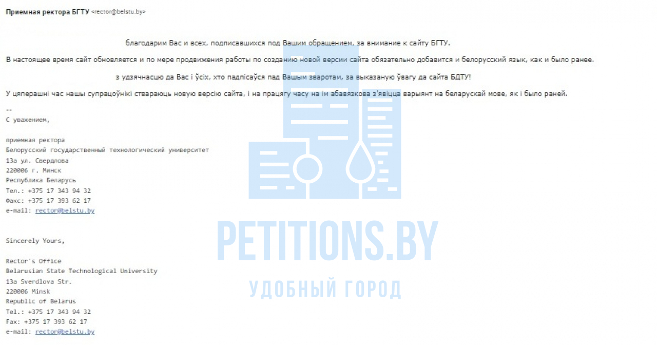 Таму, на наш погляд, практыка вядзення сайту БДТУ фактычна толькі на рускай мове дыскрымінуе грамадзян, якія карыстаюцца беларускай мовай.