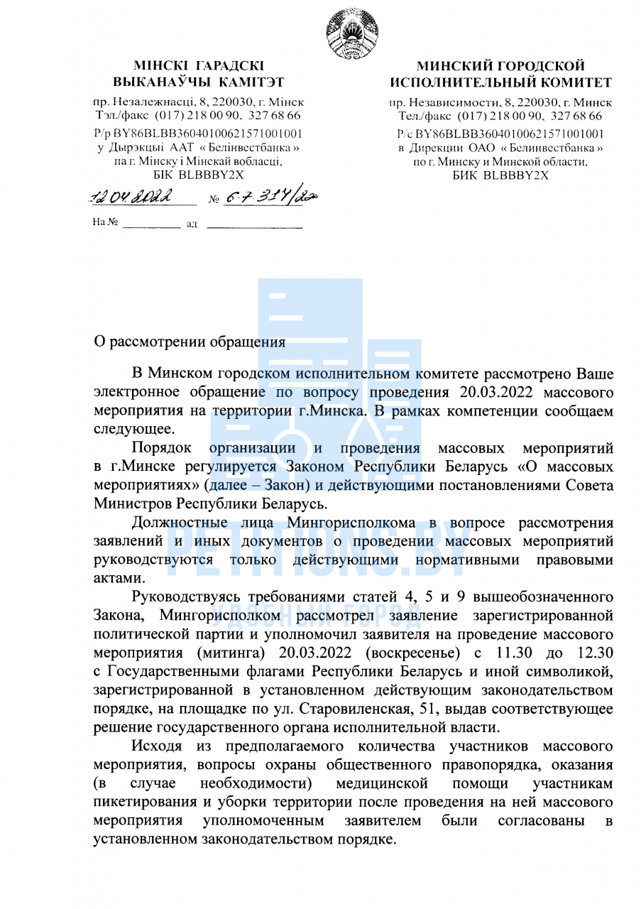 Согласно ст.6 указанного выше Закона решение руководителя местного исполнительного и распорядительного органа или его заместителя о разрешении или запрещении проведения массового мероприятия принимается с учётом даты, места, времени его проведения, количества участников, погодных условий, оплаты услуг по охране общественного порядка, оказываемых органами внутренних дел, расходов, связанных с медицинским обслуживанием, уборкой территории после проведения на ней массового мероприятия, и других обстоятельств, влияющих на обеспечение общественной безопасности, по согласованию с республиканскими органами государственного управления (их территориальными подразделениями), ответственными за обеспечение общественного порядка и безопасности.