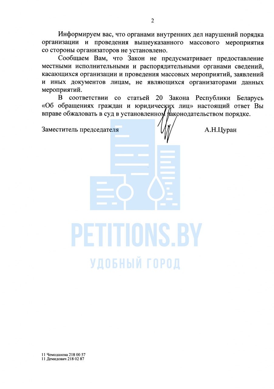 - в случае установления фактов нарушения законодательства при проведении вышеуказанного массового мероприятия (отсутствие разрешительных документов у организаторов, несоблюдения порядка организации или проведения массового мероприятия) начать административный процесс против его организаторов и участников, и привлечь их к административной ответственности по статье 24.23 КоАП.