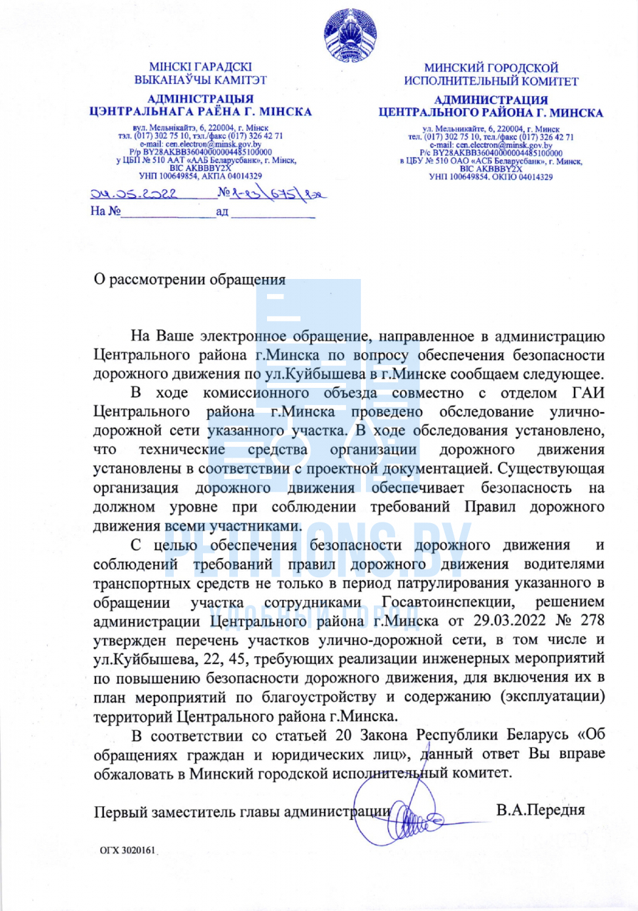 Существующая организация дорожного движения на указанном в обращении участке обеспечивает безопасность на должном уровне при соблюдении ПДД. Решением администрации Центрального района г.Минска от 29.03.2022 №278 утверждён перечень участков улично-дорожной сети, требующие реализации инженерных мероприятий по повышению безопасности дорожного движения, для включения их в план мероприятий по благоустройству и содержанию территорий Центрального района г.Минска.