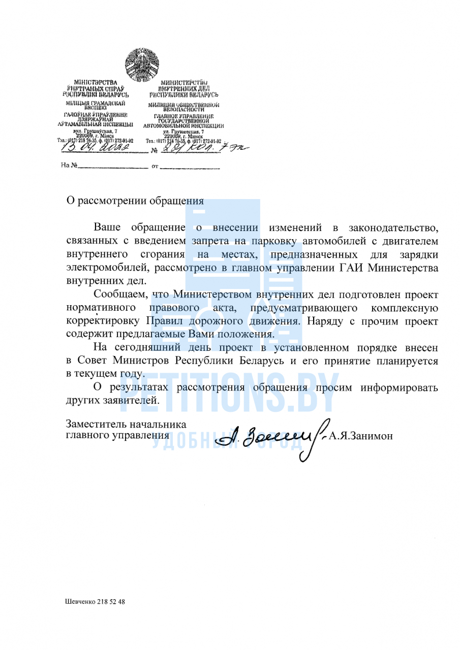 МВД подготовлен проект нормативного правового акта, предусматривающий комплексную корректировку Правил дорожного движения. Наряду с прочим проект содержит предлагаемые заявителями обращения положения. Проект в установленном порядке внесён в Совет Министров и его принятие планируется в текущем году.