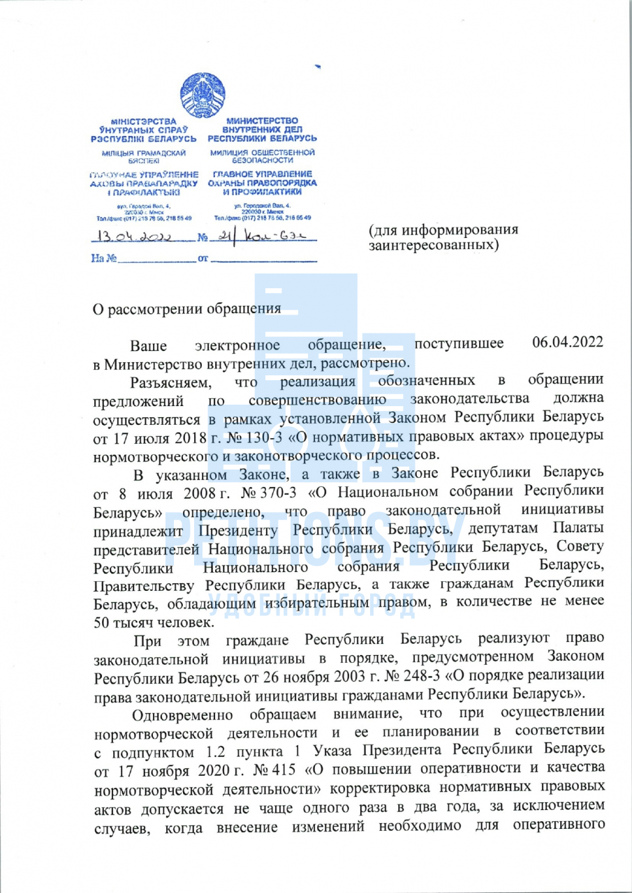 В соответствии с п.9 Положения о Министерстве внутренних дел Республики Беларусь (утв. Указом Президента от 04.12.2007 №611) МВД в пределах своей компетенции и в соответствии с законодательством осуществляет анализ состояния общественного порядка и вносит в установленном порядке в государственные органы предложения по повышению эффективности борьбы с преступностью, охраны общественного порядка и обеспечения общественной безопасности, а также принимает правовые акты и осуществляет контроль за их исполнением, участвует в подготовке проектов законодательных и других нормативных правовых актов.