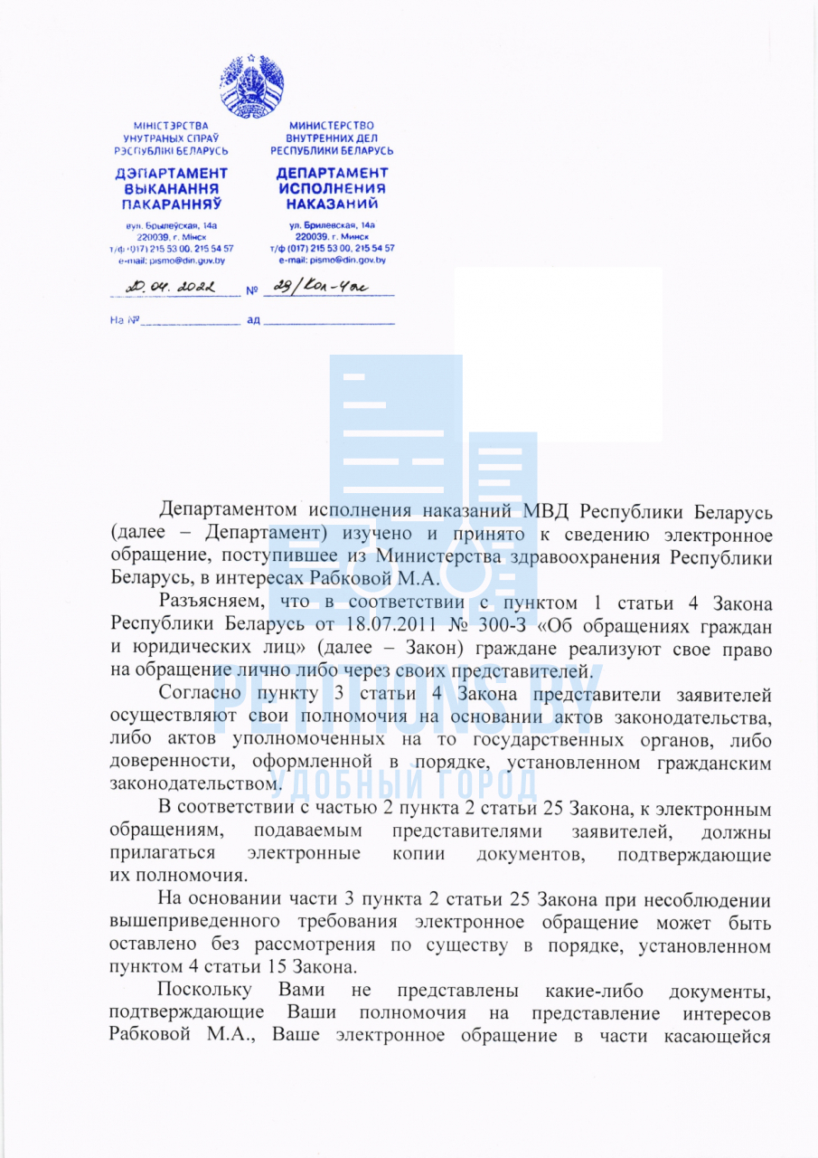 Обращение в часи касащейся оказания медпомощи Рабковой М.А. оставлено без расммотрения. Оказание медпомощи спецконтингенту осуществляется в соответствии с требованиями нормативно-правовых актов Минздрава, МВД и других законодательных актов.