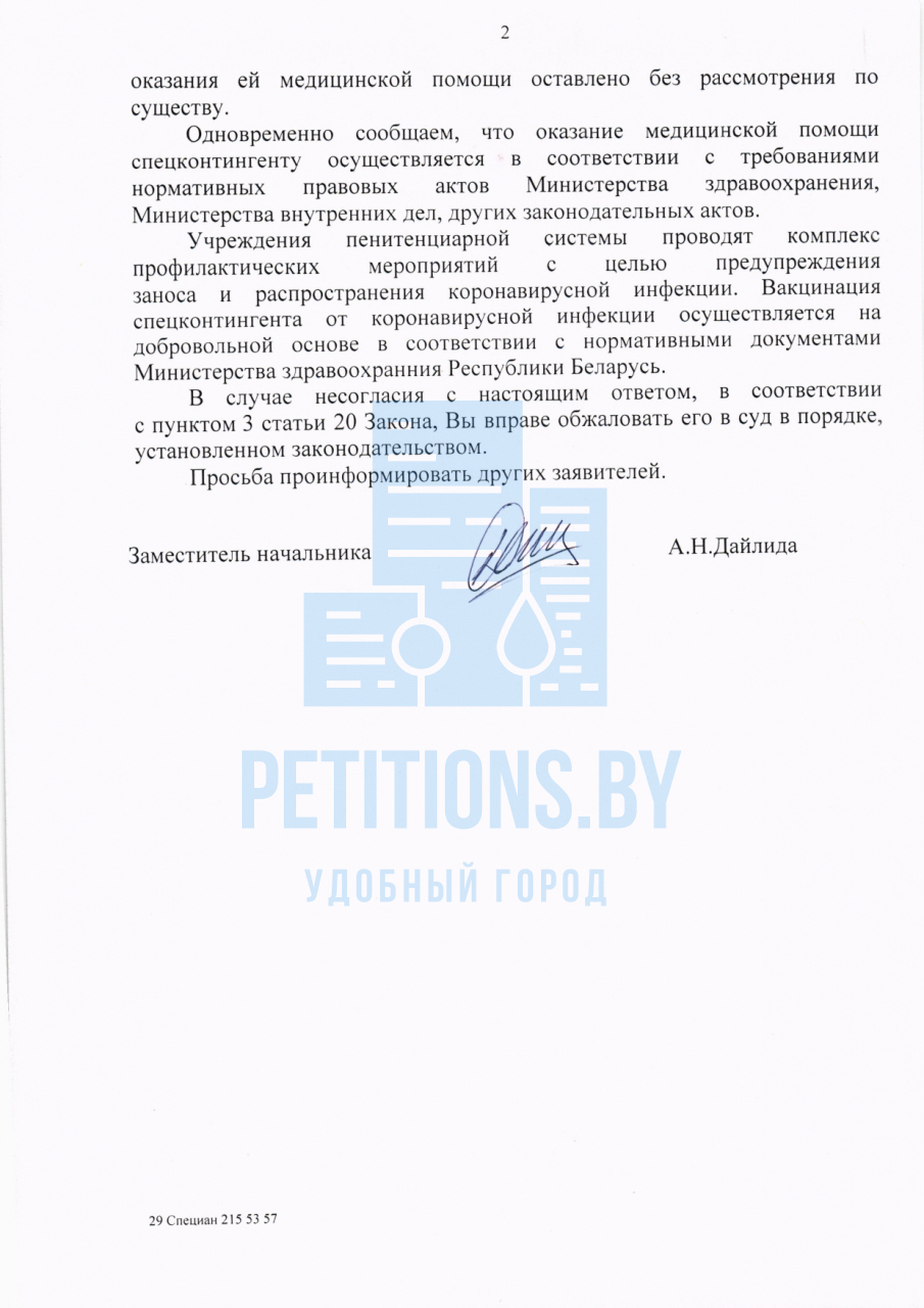 - обеспечить проведение надлежащего медицинского осмотра лиц, содержащихся в местах лишения свободы, и проведения добровольной вакцинации против COVID-19 по медицинским показаниям – для предотвращения распространения вирусной инфекции.