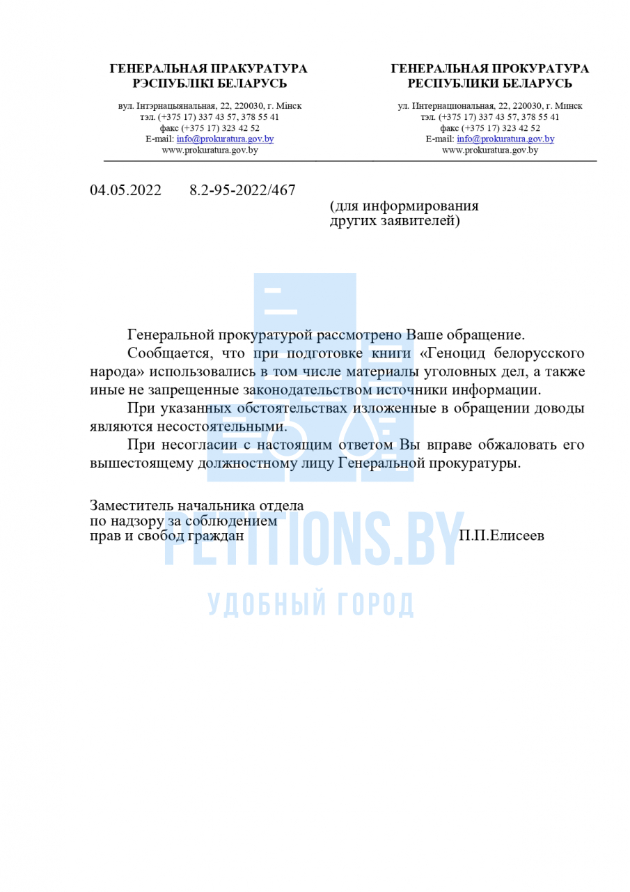 При подготовке книги "Геноцид белорусского народа" использовались материалы уголовных дел, а также иные не запрещённые законодательством источники информации. Доводы, изложенные в обращении, являются несостоятельными.