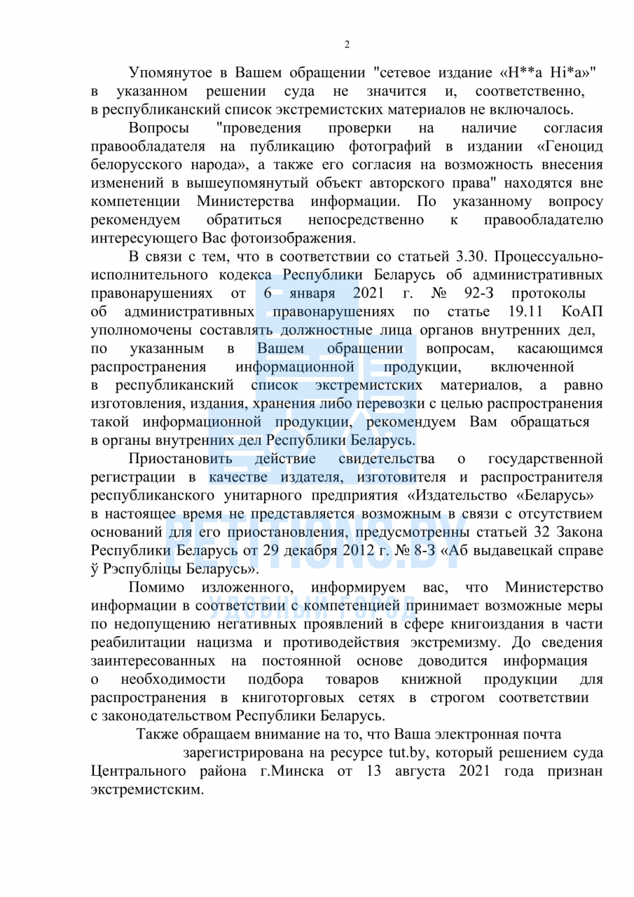 Сетевое издание «Н**а Ні*а» в республиканский список экстремистских материалов не включалось. По вопросу о наличии согласия на публикацию фото в издании «Геноцид белорусского народа» заявителям рекомендуется обратиться к правообладателю фотографии. Приостановить действие свидетельства о государственной регистрации в качестве издателя, изготовителя и распространителя РУП «Издательство «Беларусь» не представляется возможным в связи с отсутствием оснований для его приостановления.