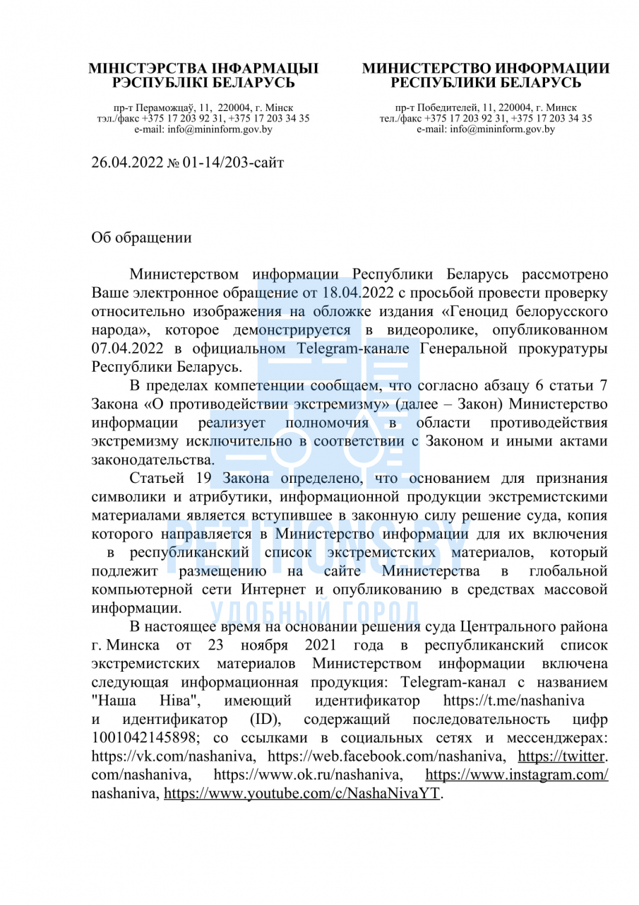 «Н**а Ні*а» является сетевым изданием, чья информационная продукция признана решением суда Центрального района г.Минска от 23 ноября 2021 года экстремистской, и включена в Республиканский список экстремистских материалов по состоянию на 09.04.2022 (прилагается к обращению).