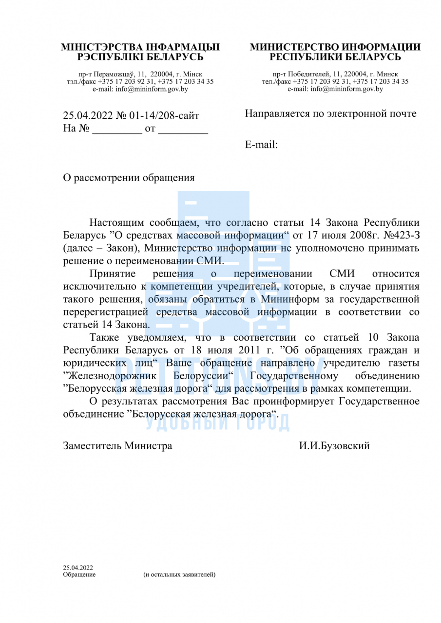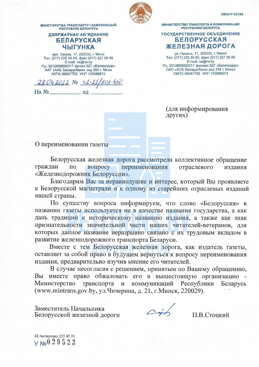 В связи с этим обращаемся с просьбой рассмотреть вопрос о переименовании издания «Железнодорожник Белоруссии» в «Железнодорожник Беларуси».