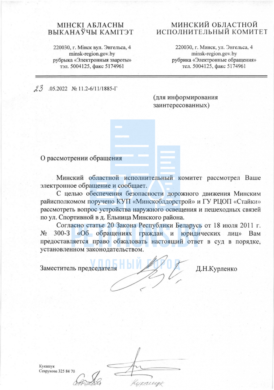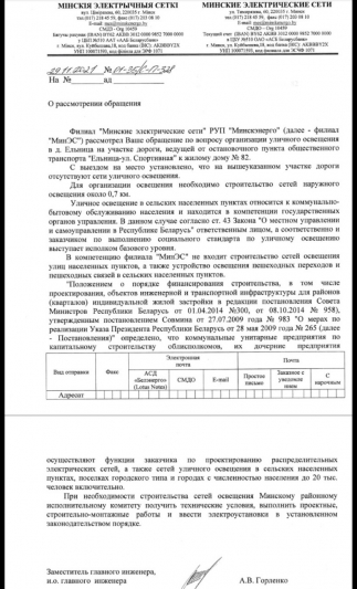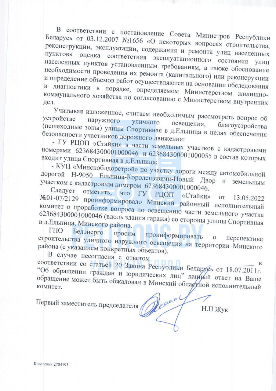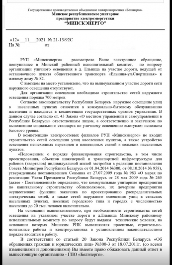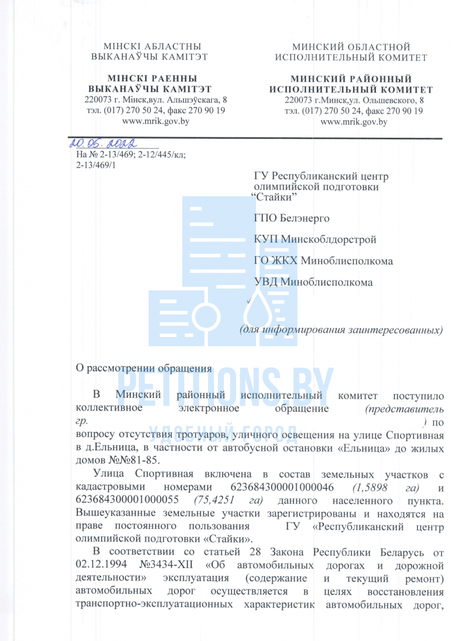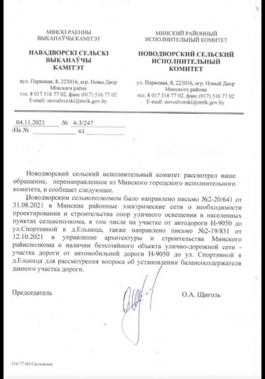 Минским райисполкомом поручено КУП "Минскоблдорстрой" и ГУ РЦОП "Стайки" рассмотреть вопрос устройства наружного освещения и пешеходных связей по ул.Спортивная в д.Ельница.