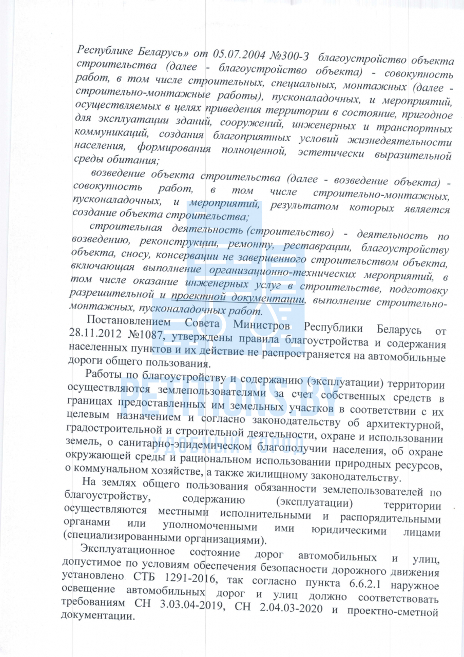 В соответствии с п.5 Правил благоустройства и содержания населенных пунктов (утв. постановлением Совмина от 28.11.2012 г. N1087) благоустройство и содержание (эксплуатация) территории осуществляются в соответствии с требованиями нормативных правовых актов, в том числе технических нормативных правовых актов, в целях приведения территории в состояние, пригодное для эксплуатации зданий, сооружений, инженерных и транспортных коммуникаций, создания благоприятных условий жизнедеятельности населения, и включают в себя строительство в соответствии с утвержденной в установленном порядке проектной документацией и содержание (эксплуатацию) транспортной инфраструктуры (улицы, проезды, подъезды, пешеходные пути (тротуары, надземные, наземные и подземные пешеходные переходы, лестницы, пешеходные и велосипедные дорожки).