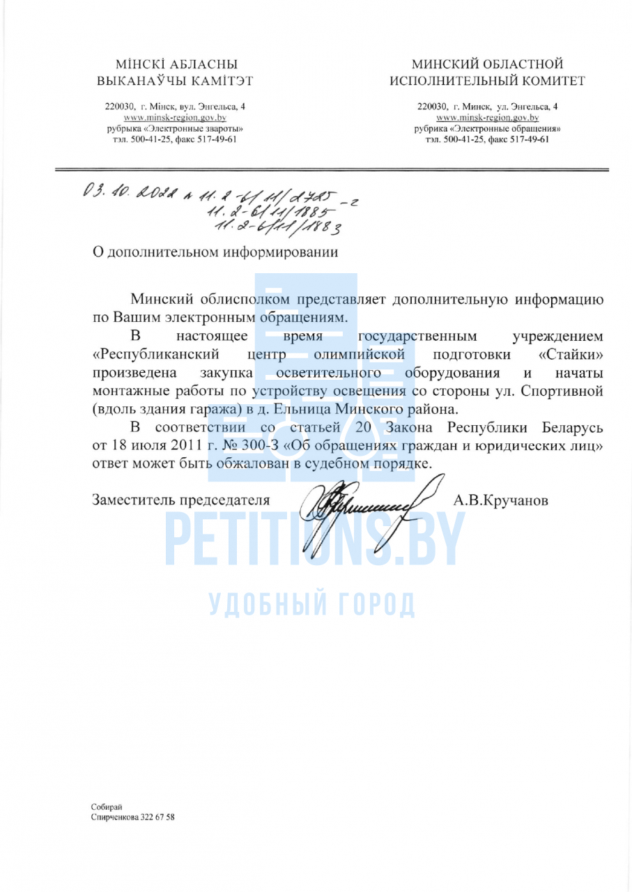 Минский райисполком считает необходимым рассмотреть вопрос об устройстве наружного уличного освещения, благоустройства улицы Спортивная в целях обеспечения безопасности участников дорожного движения. ГУ РЦОП "Стайки" проинформировало Минский райисполком о проработке вопроса по освещению части земельного участка со стороны ул.Спортивная.