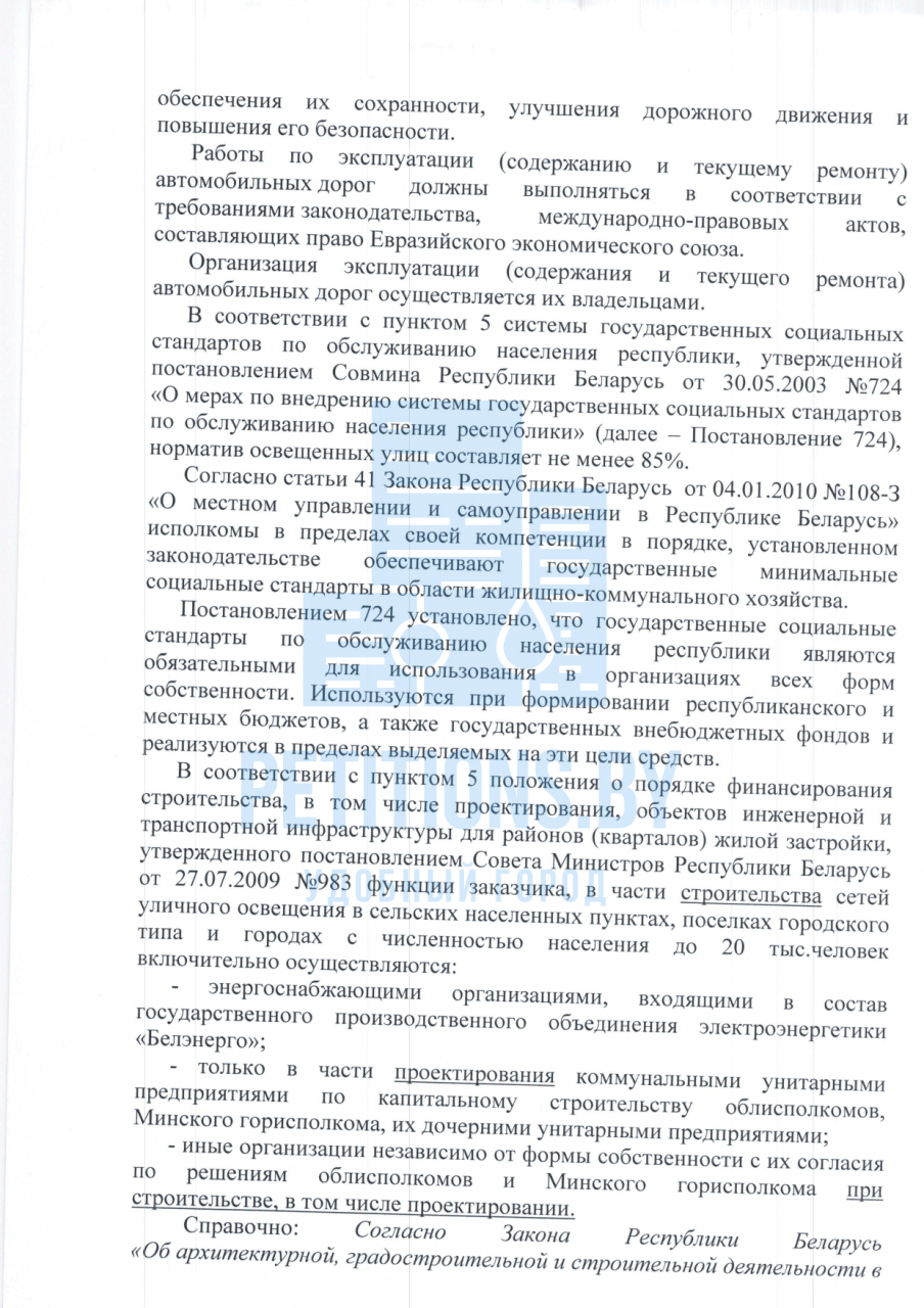 В соответствии со ст.41 и ст.43 Закона "О местном управлении и самоуправлении в Республике Беларусь" исполкомы в пределах своей компетенции в порядке, установленном законодательством, организуют строительство, реконструкцию, ремонт и содержание местных автомобильных дорог, а также организуют освещение улиц.