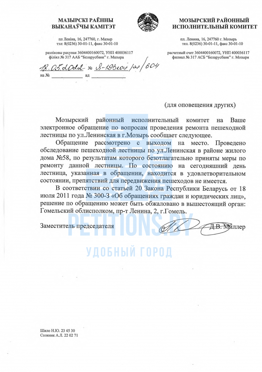 Безотлагательно приняты меры по ремонту лестницы по ул.Ленинская в районе жилого дома №58. По состоянию на сегодняшний день указанная лестница находится в удовлетворительном состоянии, препятствий для передвижения пешеходов не имеется.