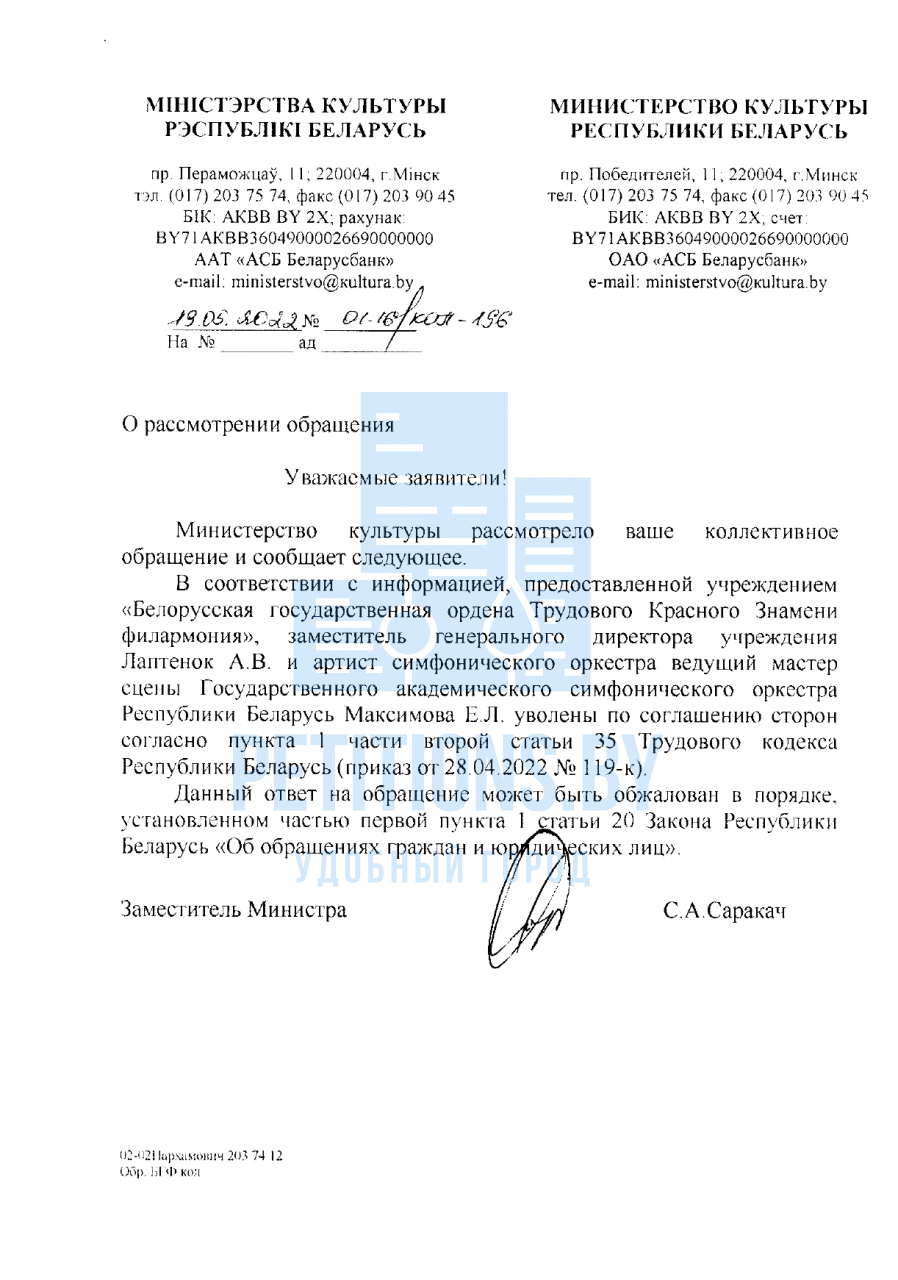 Заместитель гендиректора учреждения "Белорусская государственная ордена Трудового Красного Знамени филармония" А.В.Лаптенок и артист симфонического оркестра ведущий мастер сцены Государственного академического симфонического оркестра Е.Л.Максимова уволены по соглашению сторон.