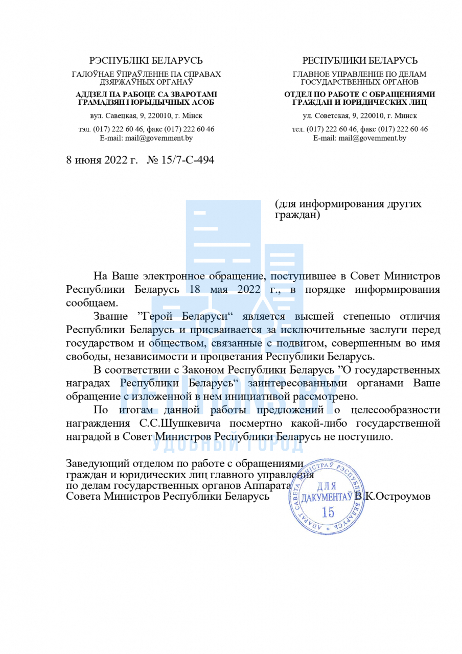 Инициатива заявителей обращения рассмотрена заинтересованными органами. Предложений о целесообразности награждения С.С.Шушкевича посмертно какой-либо государственной наградой в Совет Министров не поступило.