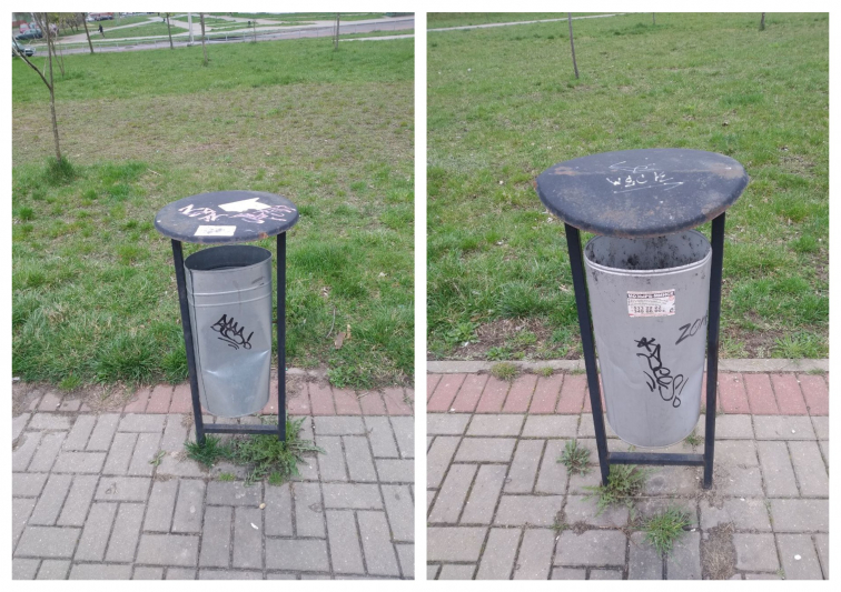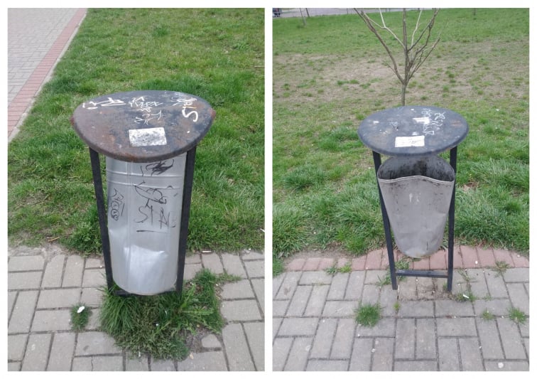 - урны для смецця сагнутыя, яны іржавыя і ў надпісах, ад якіх неабходна пазбавіцца.