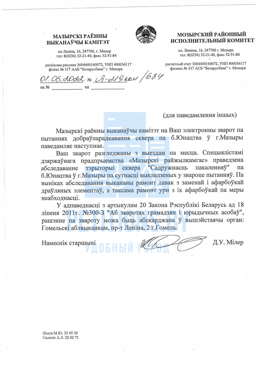 - вылучыць грашовыя сродкі на рамонт названага ў звароце сквера;