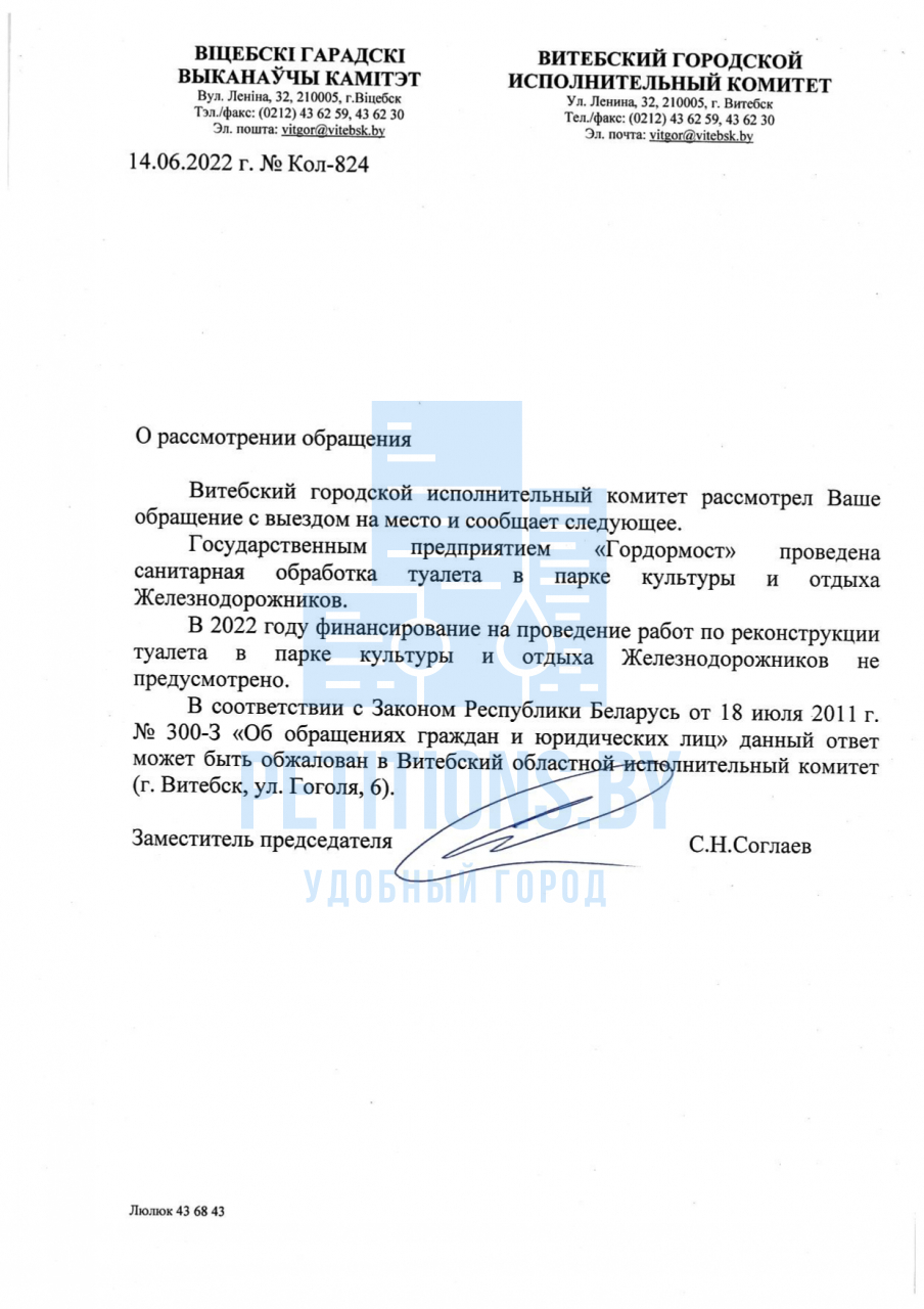 ГП "Гордмост" проведена санитарная обработка туалета в парке культуры и отдыха Железнодорожников. В 2022 г. финансирование на проведение работ по реконструкции указанного туалет не предусмотрено.