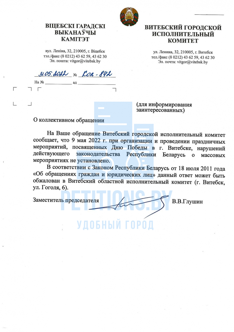 При проведении праздничных мероприятий, посвящённых Дню Победы в г.Витебске, нарушений действующего законодательства Республики Беларусь о массовых мероприятиях не установлено.
