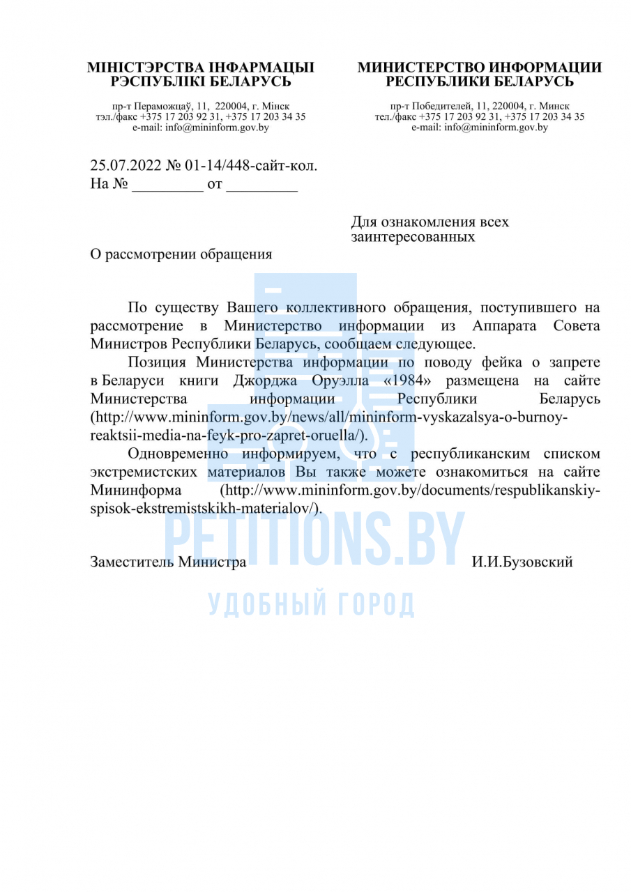 Позиция Министерства информации по поводу фейка о запрете в Беларуси книги Джорджа Оруэлла «1984» размещена на сайте Миниинформа (http://www.mininform.gov.by/news/all/mininform-vyskazalsya-o-burnoy-reaktsii-media-na-feyk-pro-zapret-oruella/).