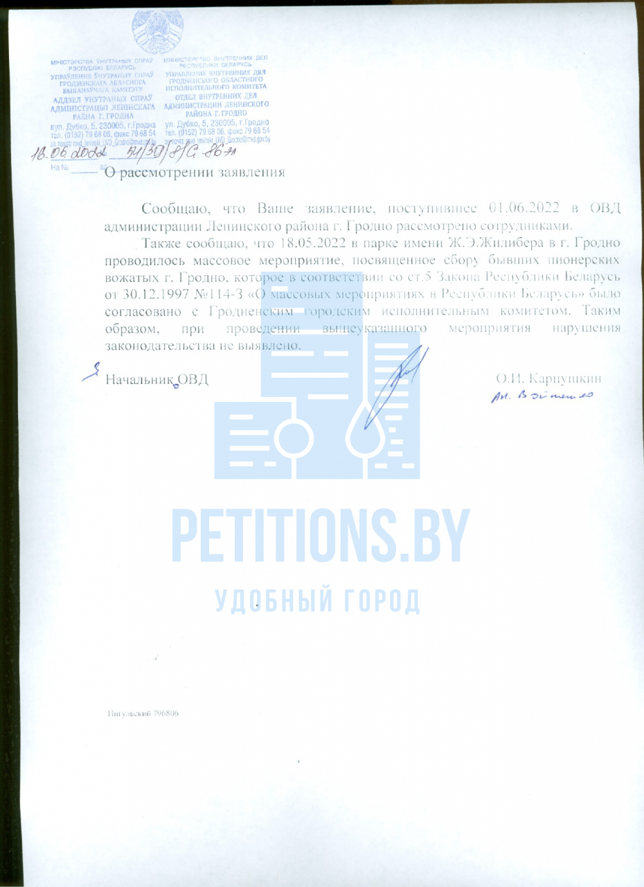 - дать правовую оценку проведённому 18 мая 2022 года в парке имени Жана Эммануэля Жилибера массового мероприятия на предмет его соответствия требованиям законодательства Республики Беларусь, регулирующего порядок проведения массовых мероприятий, в том числе решению Гродненского горисполкома 19.10.2011 №540;