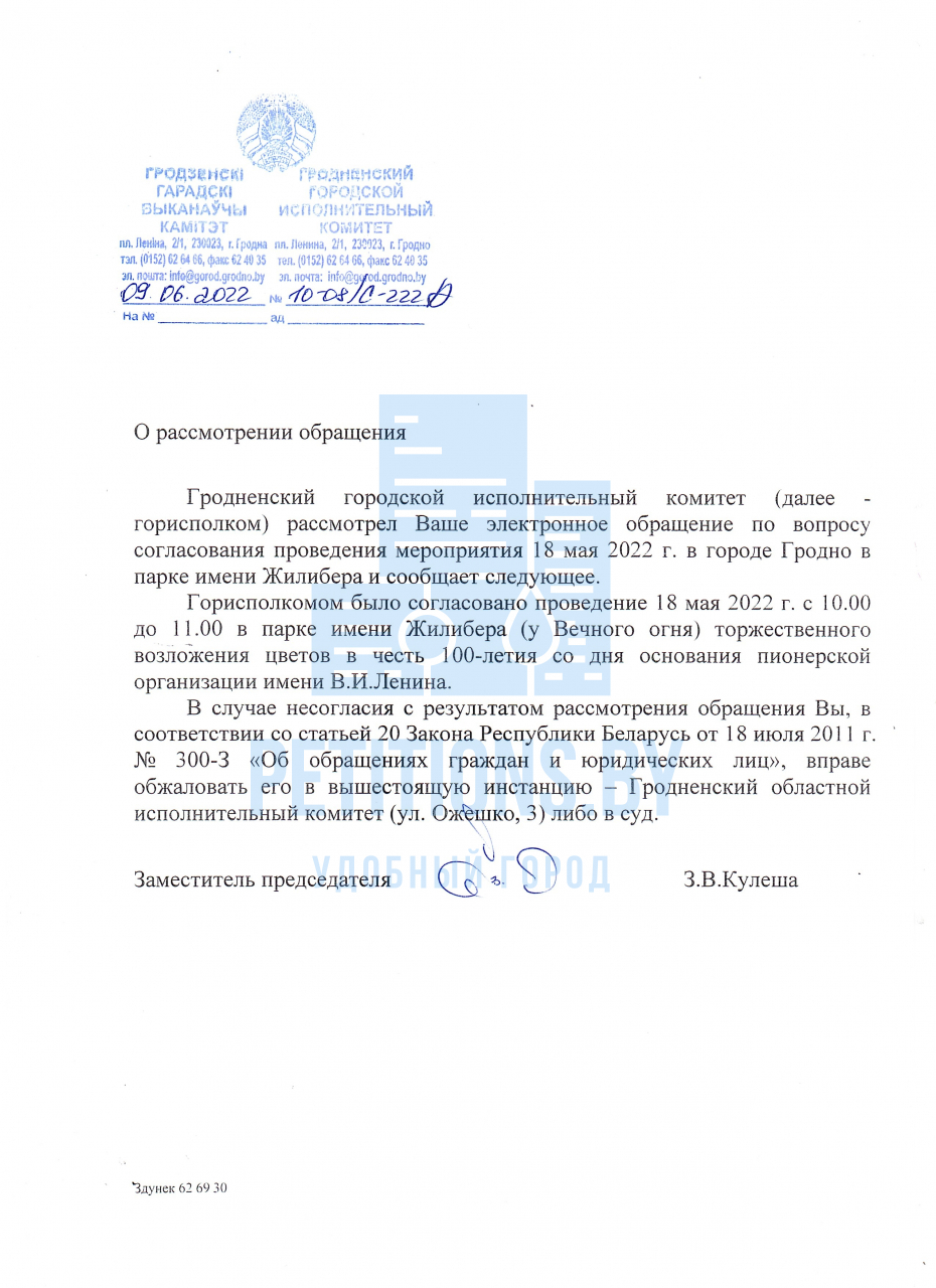 - в случае, если такое разрешение организаторами мероприятия было получено, указать нормативно-правовые основания, позволяющие проводить массовое мероприятие в месте, где проведение подобных мероприятий не допускается согласно решению Гродненского горисполкома 19.10.2011 №540.