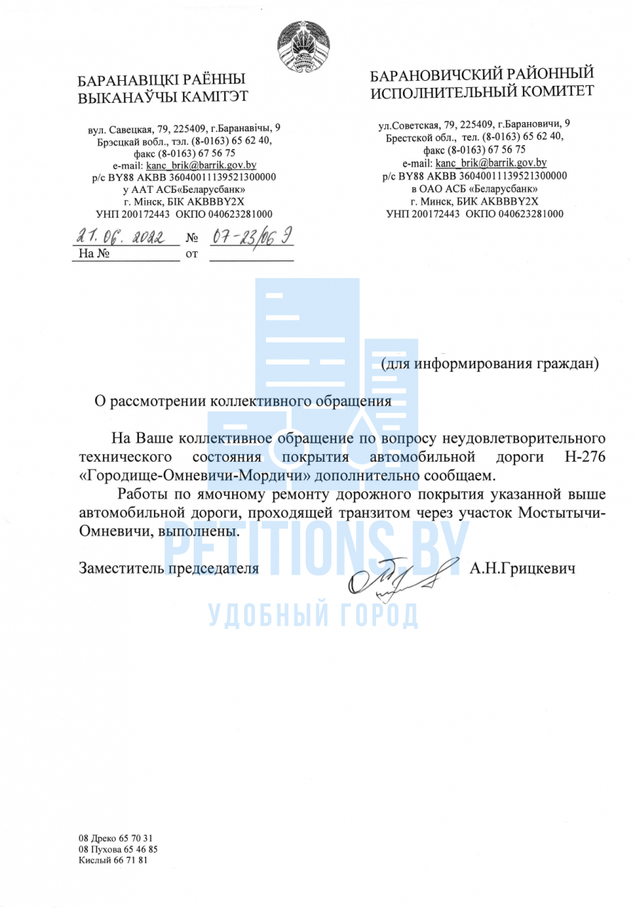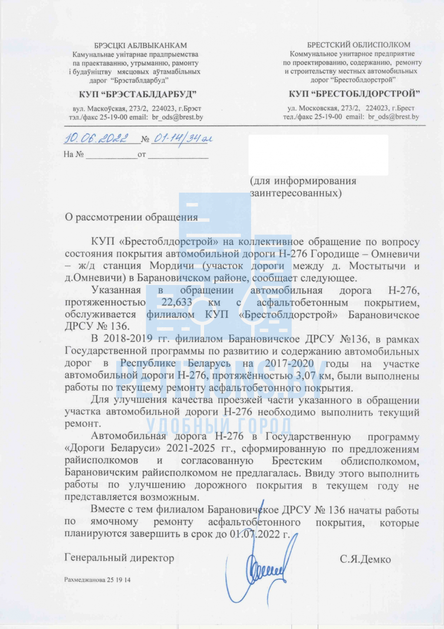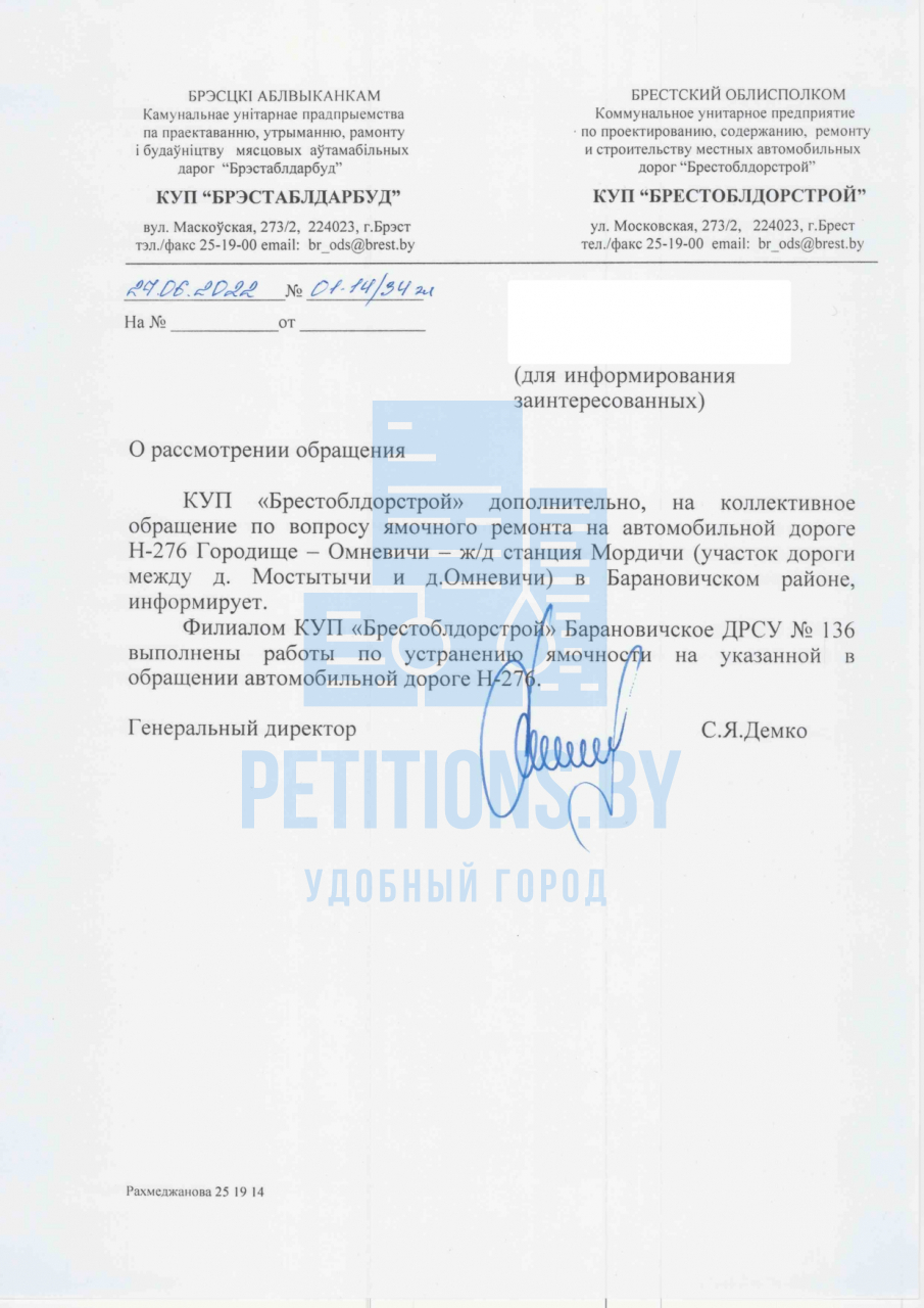 С целью поддержания соответствующего уровня требований и эксплуатационного состояния местных автомобильных дорог и улиц населенных пунктов района специализированной организацией - филиалом КУП "Брестоблдорстрой" Барановичское ДРСУ № 136 регулярно осуществляется Мониторинг состояния дорожного покрытия C последующим (при необходимости) выполнением работ по ямочному ремонту. Также сообщаем. Указанный выше объект внесен в перспективный план дорожных работ по текущему ремонту при условии выделения дополнительного финансирования.