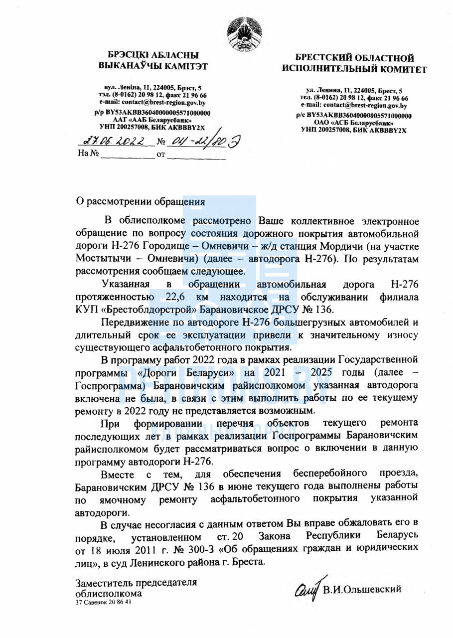 Автодорога Н-276 в Государственную программу "Дороги Беларуси" 2021-2025 гг Барановичским райисполкомом не предлагалась, ввиду этого выполнить работы по улучшению дорожного покрытия в текущем году не представляется возможным. Вместе с тем начаты работы по ямочному ремонту асфальтобетонного покрытия, которые планируется завершить до 01.07.2022.