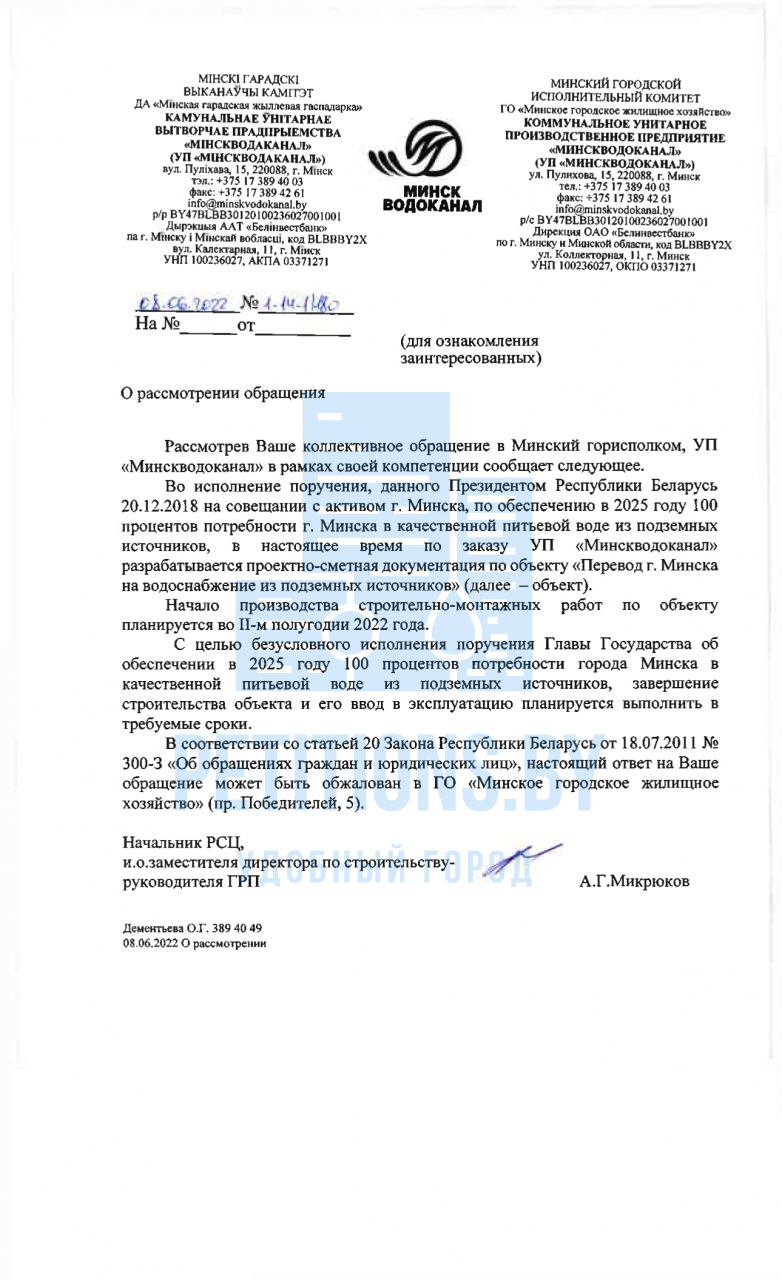 Таким образом, просим завершить реализацию проекта по переводу Фрунзенского, Московского и Октябрьского районов г.Минска на подземные источники водоснабжения не позднее 2025 года, как обещал Владимир Кухарев.