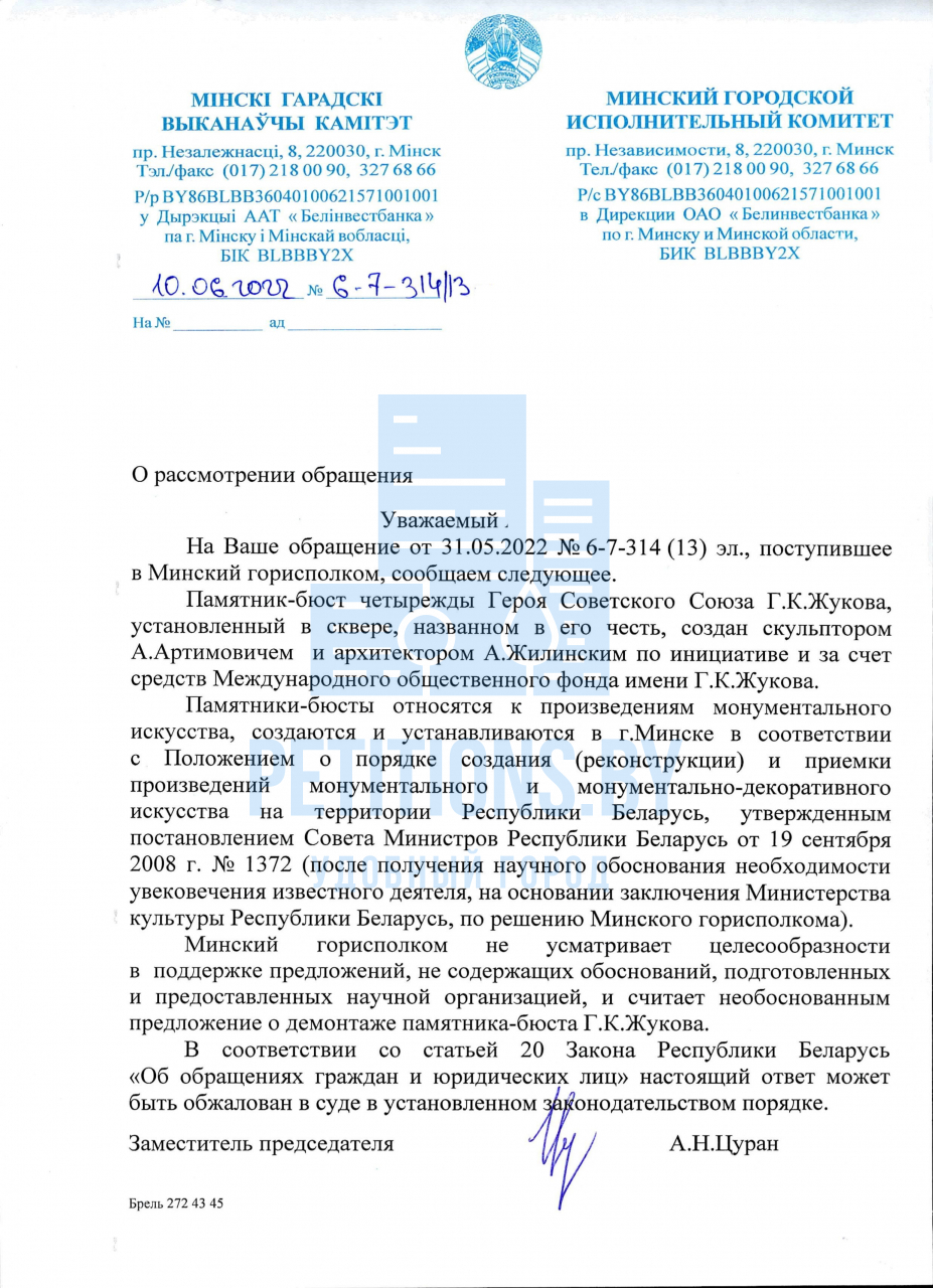 Минский горисполком не усматривает целесообразности в поддержке предложений,не содержащих обоснований,и считает необоснованным предложение о демонтаже памятника - бюста Г.К. Жукова