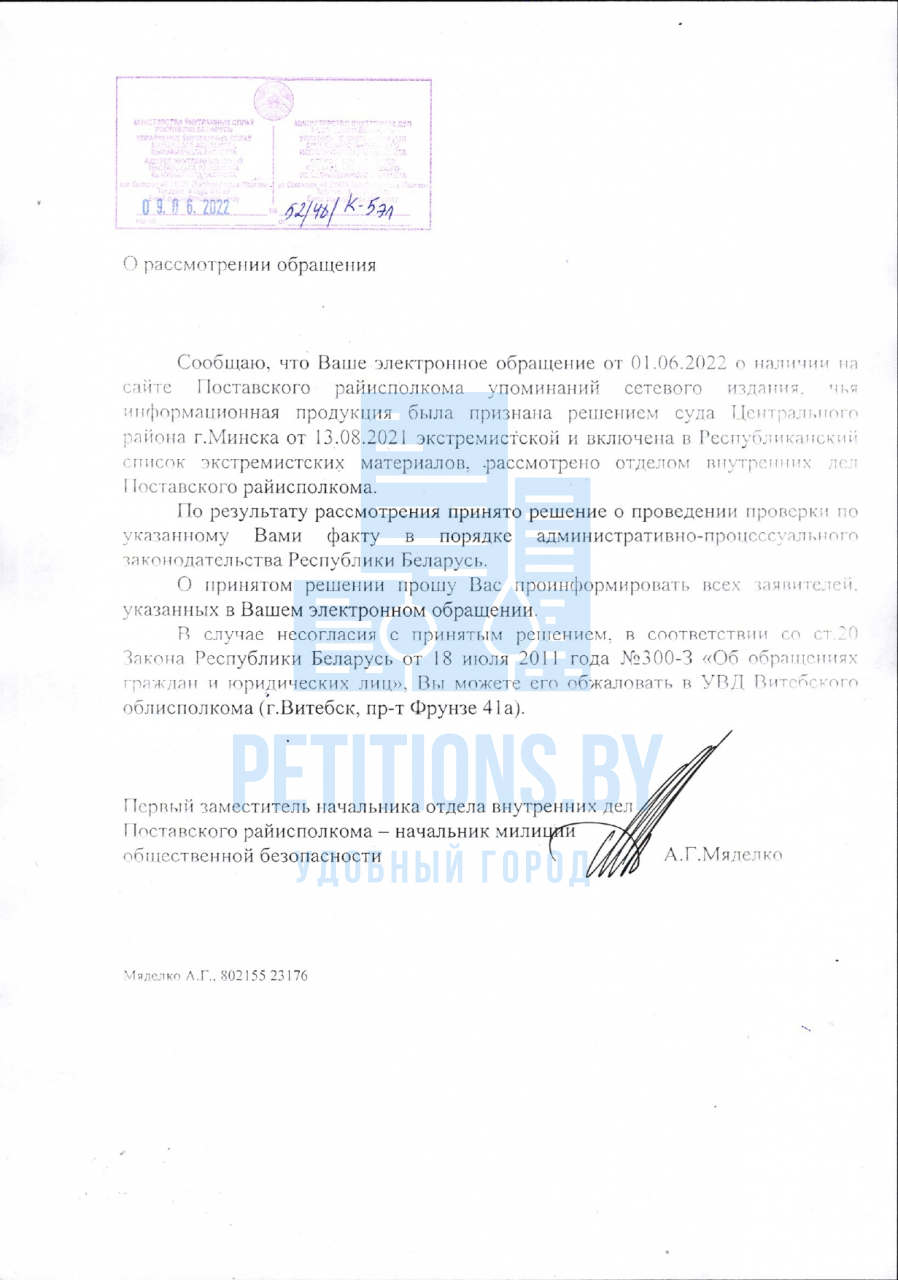 - установить должностных лиц Поставского райисполкома, которые осуществляли (и не препятствовали) распространению информации, признанной экстремистской, и включенной в Республиканский список экстремистских материалов, и привлечь их к дисциплинарной ответственности. Просим проинформировать заявителей в ответе на коллективное обращение о принятых к указанным выше лицам мер дисциплинарной ответственности;