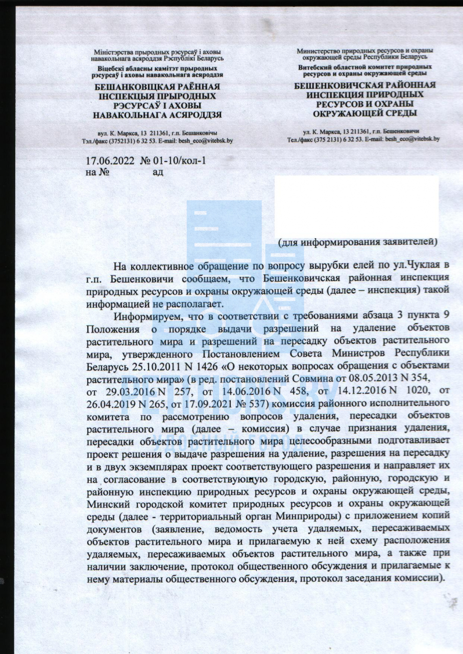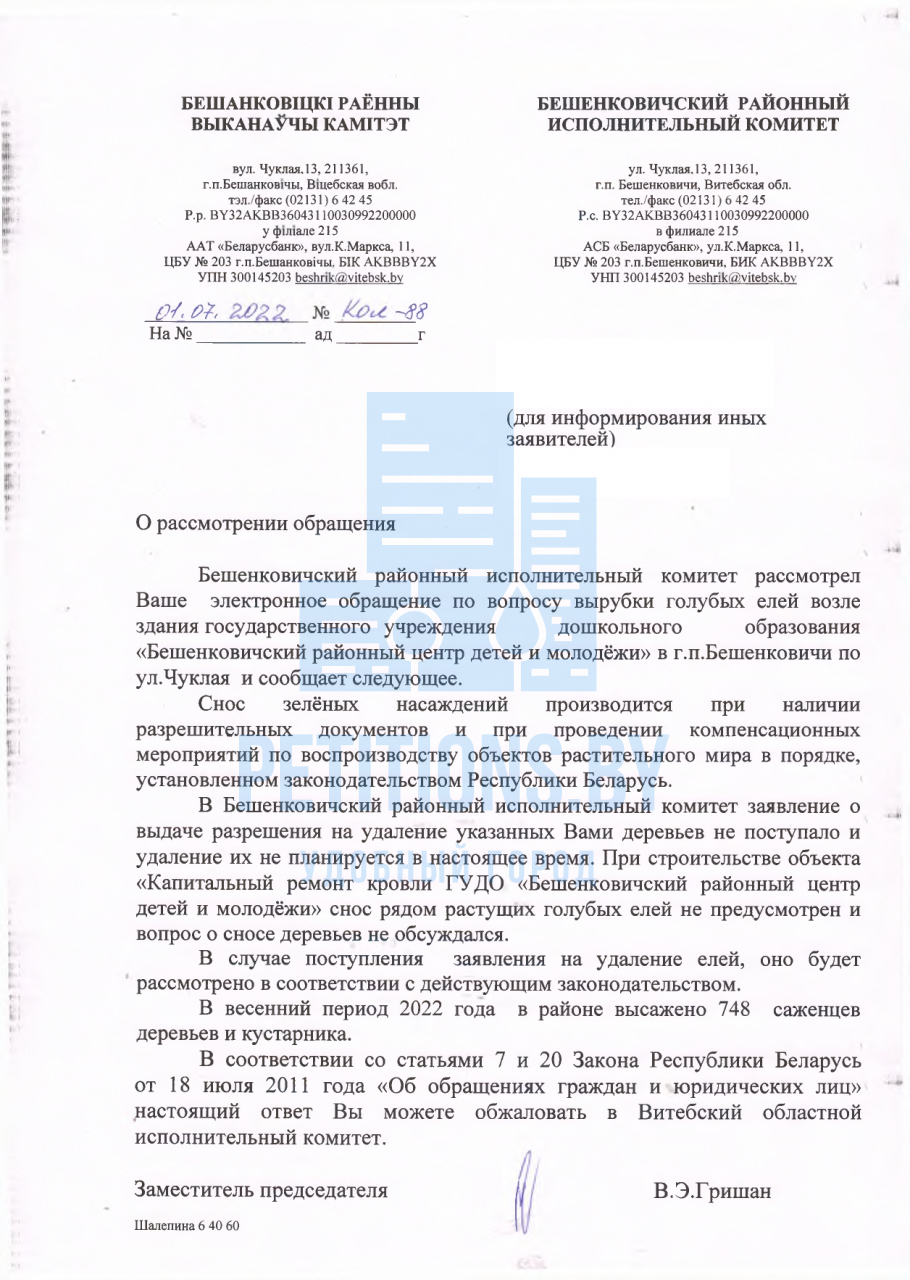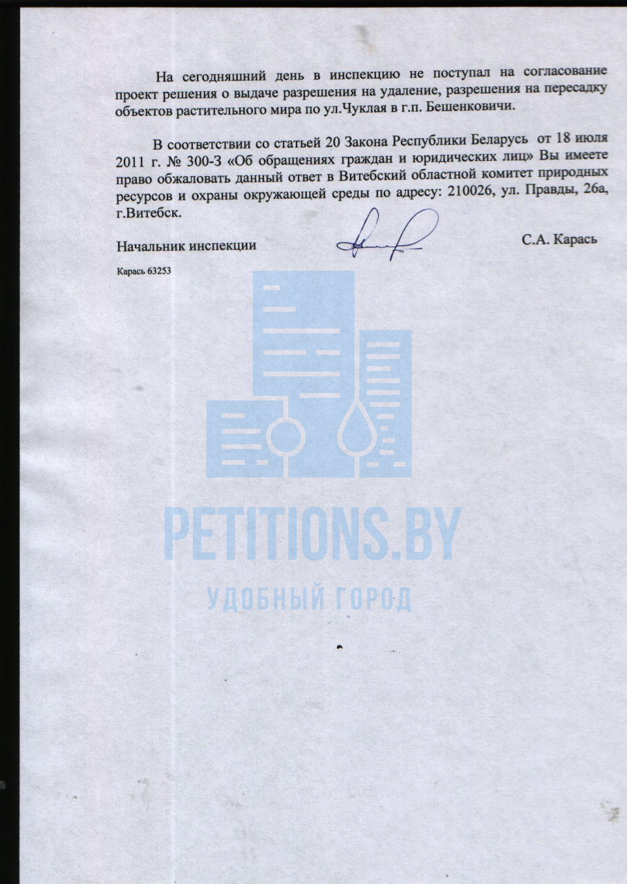 В Бешенковичский райисполком заявление о выдаче разрешения на удаление указанных в обращении деревьев не поступало и удаление их не планируется в настоящее время.