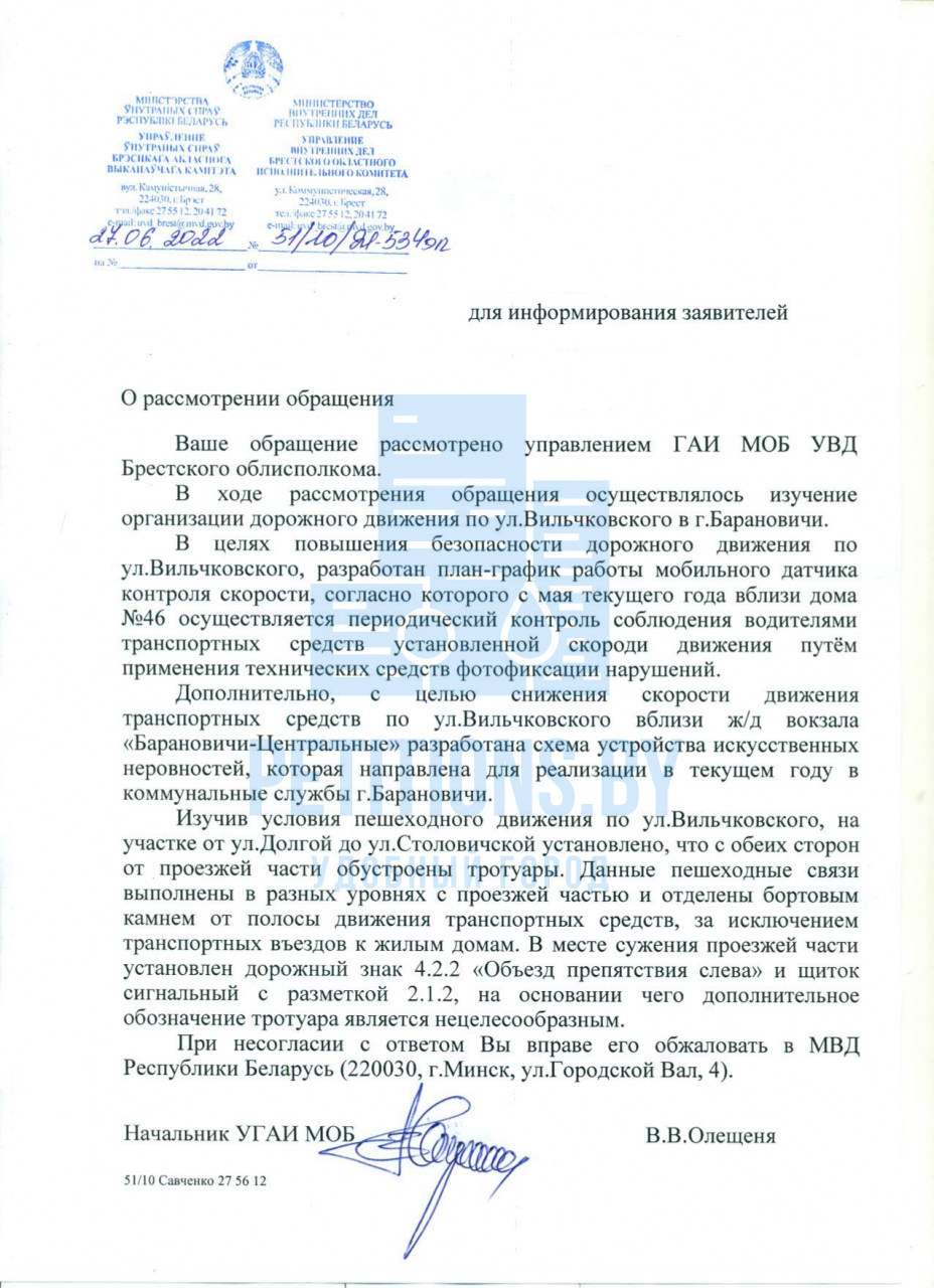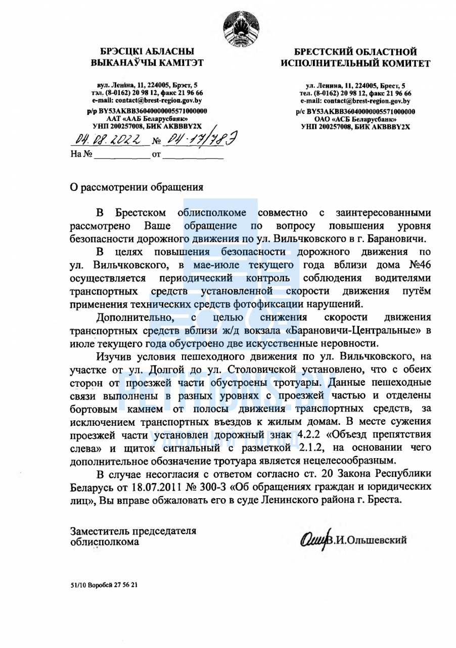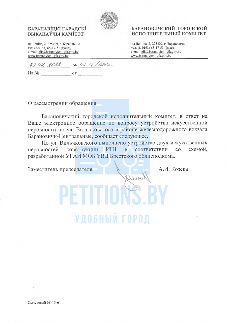 Настоящим обращением мы хотим привлечь внимание госорганов и обеспечить безопасность жителей и гостей города Барановичи при их передвижении по улице Вильчковского.