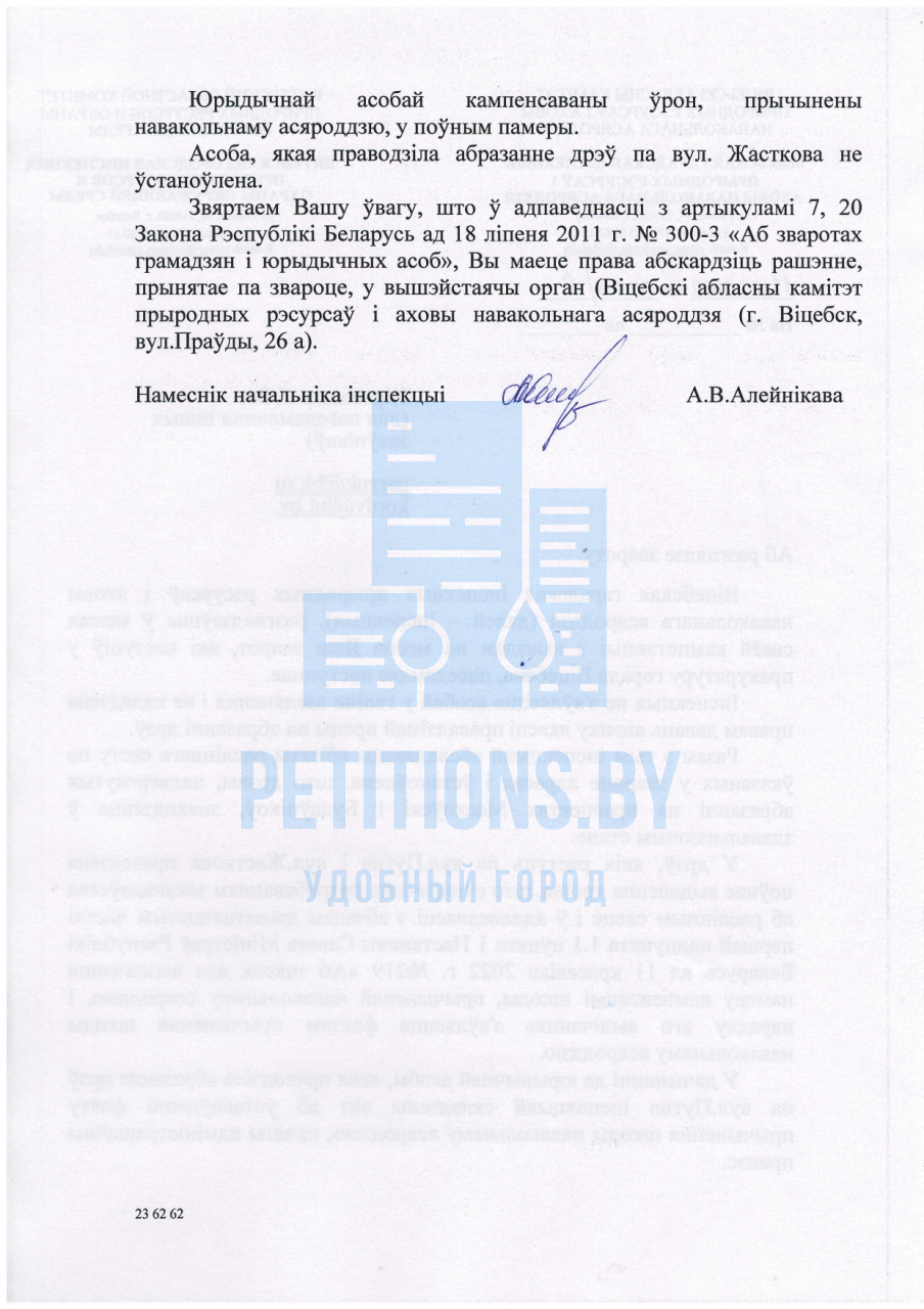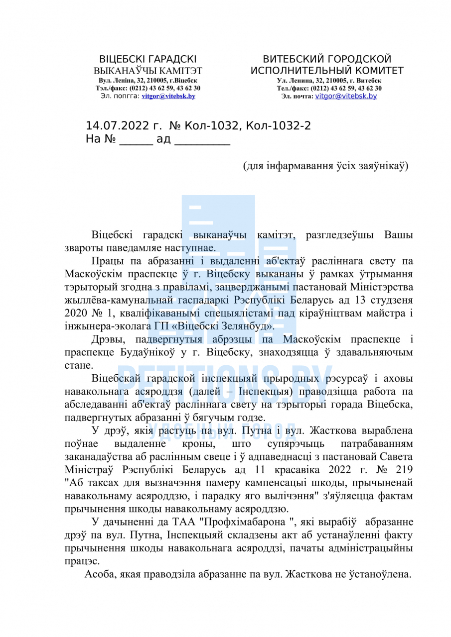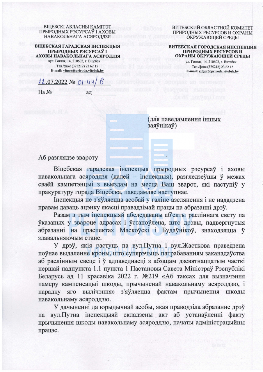 Дрэвы, падвергнутыя абрэзцы па Маскоўскім праспекце і праспекце Будаўнікоў, знаходзяцца ў здавальняючым стане. У дачыненні да ТАА "Профхімабарона", які вырабіў абразанне дрэў па вул.Путна, Віцебскай гарадской інспекцыяй прыродных рэсурсаў і аховы навакольнага асяроддзя складзены акт аб устанаўленні факту прычынення шкоды навакольнага асяроддзі, пачаты адміністрацыйны працэс. Асоба, якая праводзіла абразанне па вул.Жасткова не ўстаноўлена.