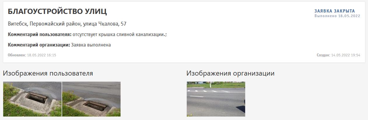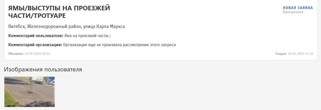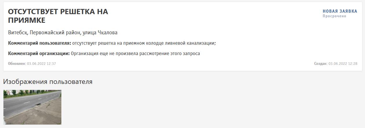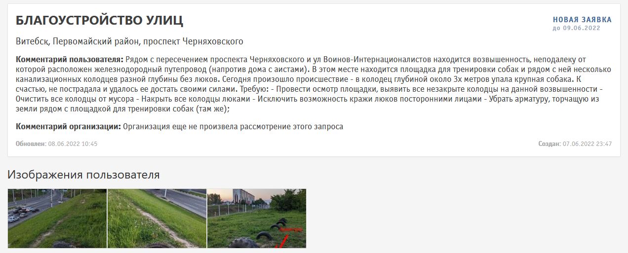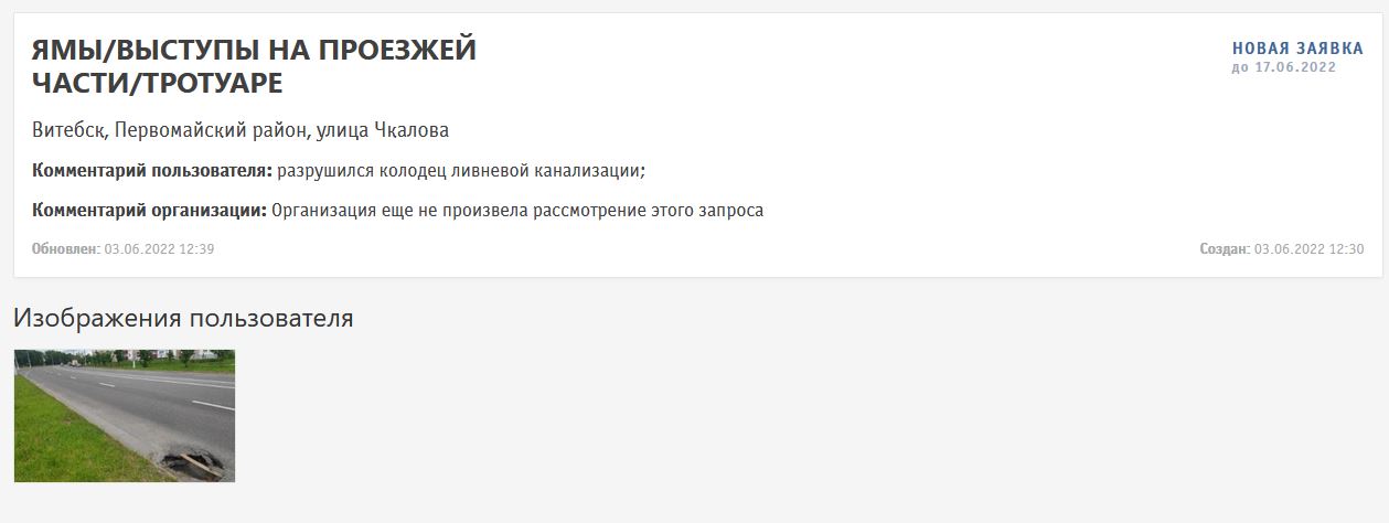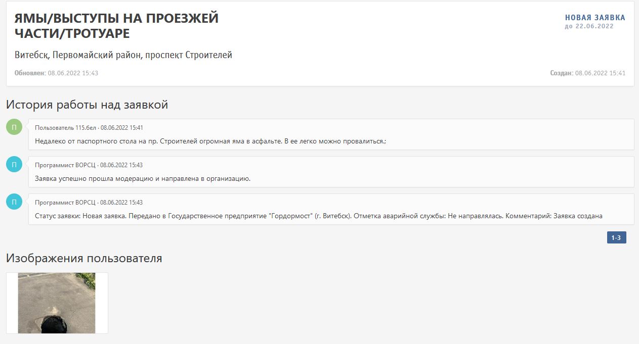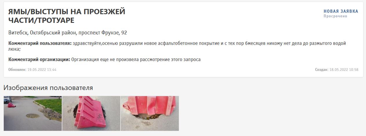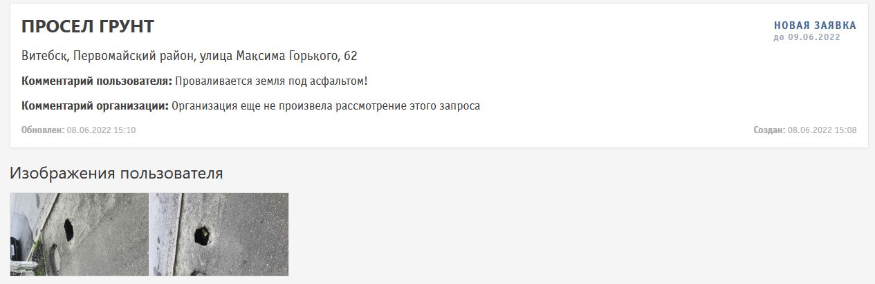 Проведен предварительный анализ содержательной части заявок, поданных через портал диспетчерской службы «115.бел» в период с 25 апреля 2022 года по 9 июня этого же года (охват — 1,5 месяца) в категории «Ямы/выступы на проезжей части/тротуаре» по городу Витебску, на предмет наличия в ней поводов к созданию опасных ситуаций в виде падения и травмирования пешеходов, а также застревания транспорта, а именно провалы грунта и открытые колодцы и приямки.