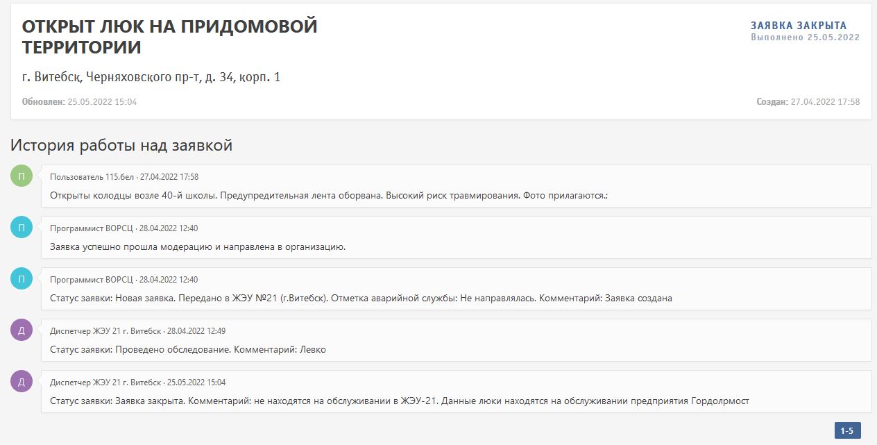• 5 заявок закрыты в связи с отсутствием исполнителей в компетентностном списке службы «115.бел», только о двух из них известно, что они официально переданы другим эксплуатирующим организациям;