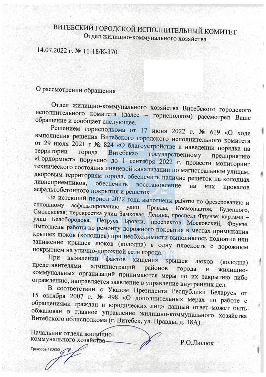 За истекший период 2022 г. выполнены работы по фрезерованию и сплошному асфальтированию некоторых улиц и перекрёстков г.Витебска. Выполнены работы по ремонту дорожного покрытия в местах примыкания крышек люков, при необходимости выполнялось поднятие или занижение крышек люков в одну плоскость с дорожным покрытием.