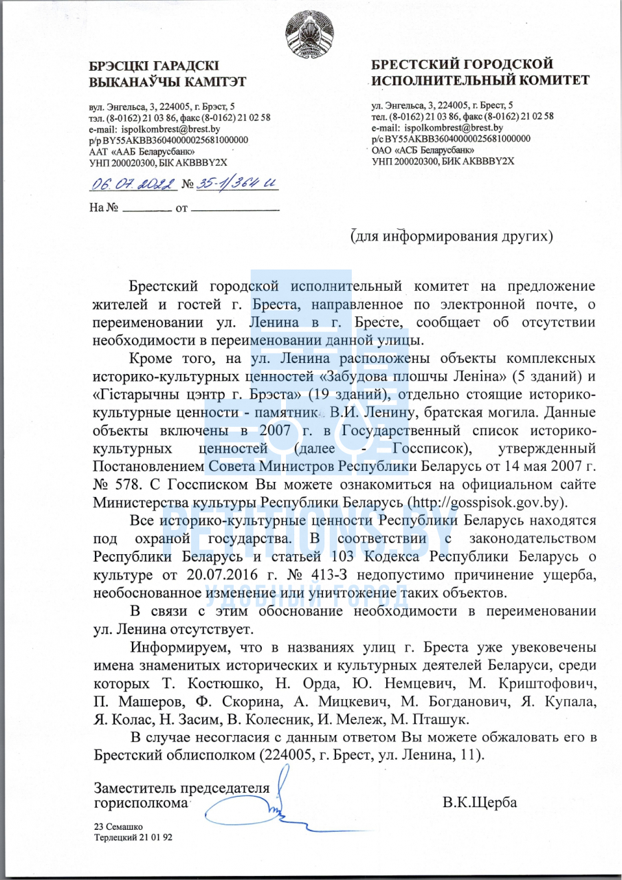 Поэтому мы, нижеподписавшиеся жители и гости города Бреста, руководствуясь ст.20 Закона "О наименованиях географических объектов", которая устанавливает, что предложения о переименовании составных частей населённых пунктов могут вносить местные исполнительные и распорядительные органы, настоящим обращением требуем Брестский горисполком , воспользоваться имеющимся у него правом и внести предложение о переименовании улицы В.И.Ленина в Брестский городской Совет депутатов.