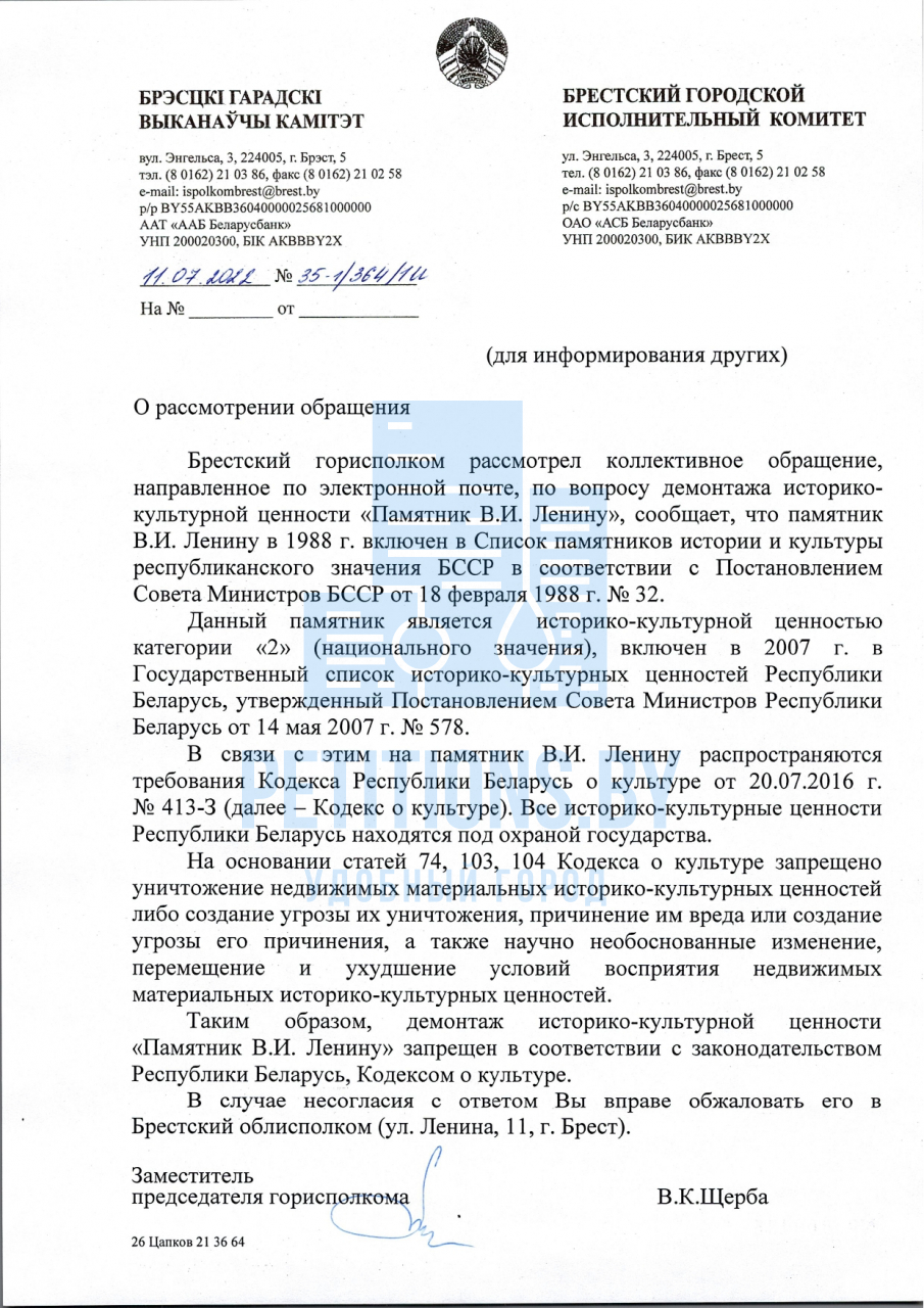 Мы, небезразличные жители и гости города Бреста, считаем что памятник советского государственного деятеля В.И.Ленина, установленный на улице Ленина, должен быть в срочном порядке демонтирован!