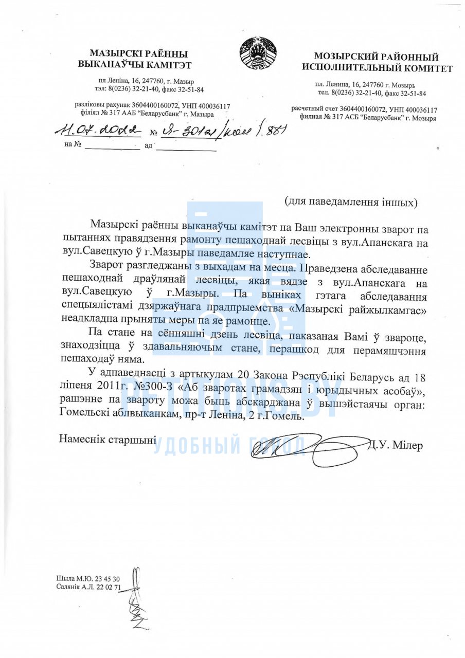 Спецыялістамі ДП "Мазырскі райжылкамгас" прынята меры па рамонце лесвіцы, пазначанай у звароце. Па стане на сённяшні дзень лесвіца знаходзіцца ў задавальняючым стане, перашкод для перамяшчэння пешаходаў няма.