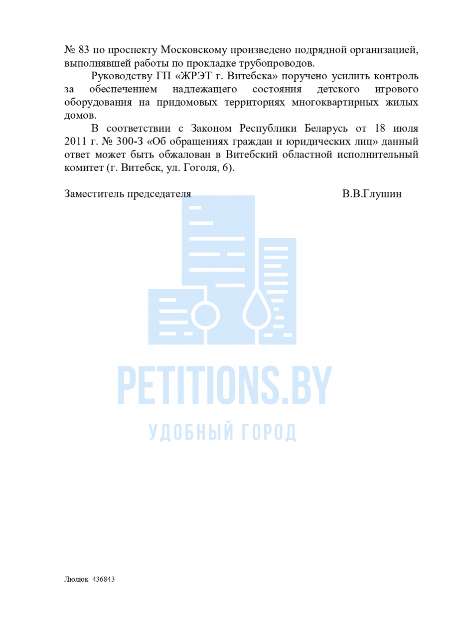 ГП "ЖРЭТ г.Витебска" ведётся постоянный контроль за состоянием оборудования детских игровых и спортивных площадок. По заявка, поступившим в службу 115, эксплуатирующей организацией принимаются меры по ремонту игрового оборудования либо его демонтажу в зависимости от его состояния. Руководству ГП "ЖРЭТ г.Витебска" поручено усилить контроль за обеспечением надлежащего состояния детского игрового оборудования на придомовых территориях.