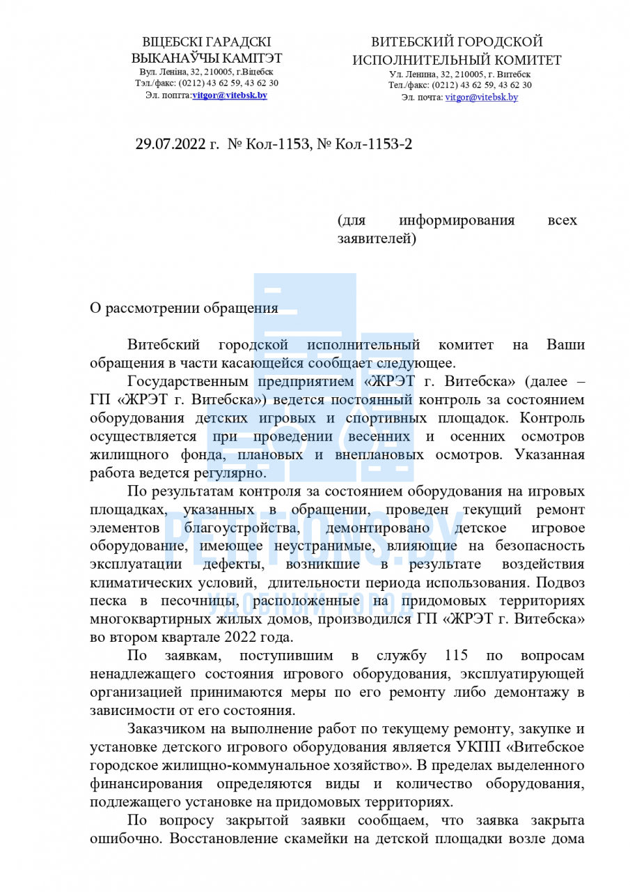 В свою очередь, заявителями настоящего обращения проанализирован состав поданных витеблянами за последние 3,5 месяца заявок через портал 115.бел в части неудовлетворительного состояния оборудования детских площадок, могущего быть причиной травмирования детей. Выявлено 14 заявок такого характера. Их перечень изложен в файле, приложенном к настоящему обращению. Также приложены фотоснимки некоторых примеров повреждений детского оборудования.