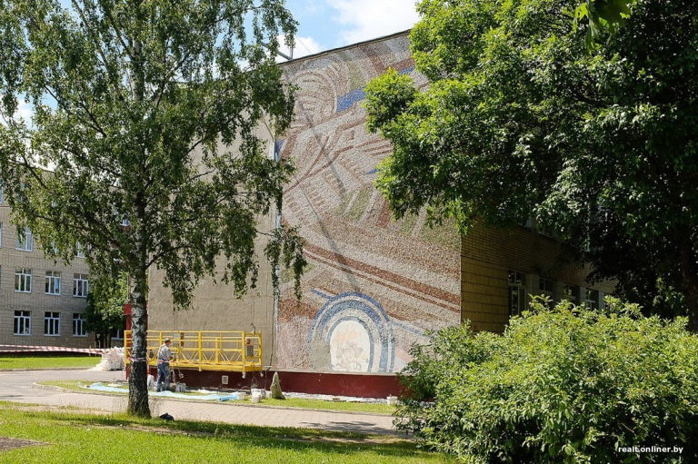 Зараз на фасадзе гімназіі №15 г. Мінска па вуліцы Максіма Багдановіча, 84 адбываецца рэканструкцыя мазаічнага пано.