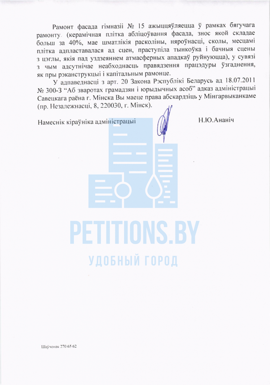 Адміністрацыя Савецкага раёна г.Мінска не мае звестак аб тым, што мазаіка з керамічнай пліткі, якая размешчана на фасадзе будынку ДУА "Гімназія №15 г.Мінска", адносіцца да манументальнага мастацтва. Рамонт фасада гімназіі ажыцяўляецца ў рамках бягучага рамонту, у сувязі з чым адсутнічае неабходнасць правядзення працэдуры ўзгаднення.