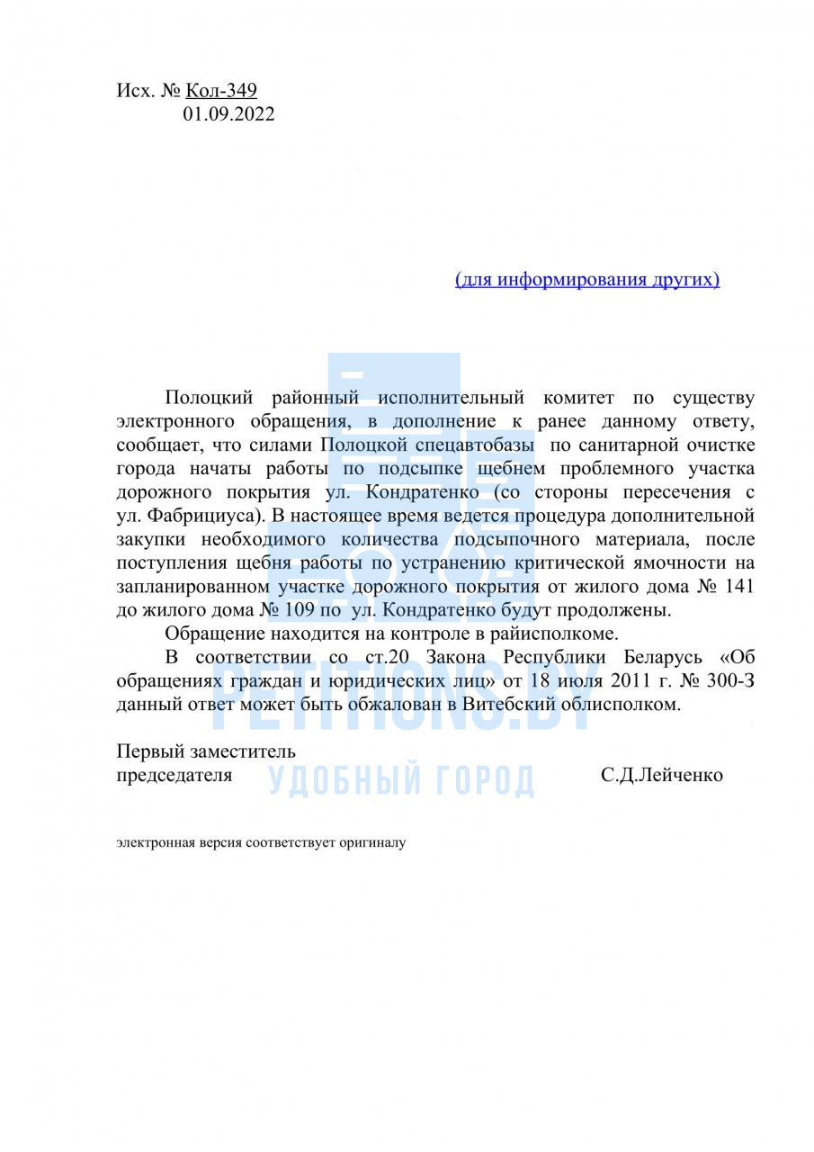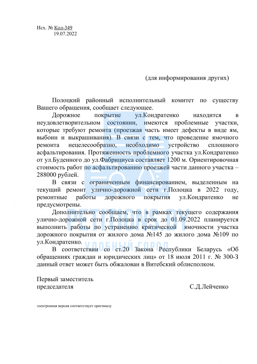 Полоцкий районный исполнительный комитет по существу электронного обращения, в дополнение к ранее данному ответу, сообщает, что в 2022 году силами Полоцкой спецавтобазы по санитарной очистке города выполнена подсыпка щебнем проблемного участка дорожного покрытия ул.Кондратенко от ул.Фабрициуса (от дома №145) до жилого дома №117. При наступлении благоприятных погодных условий (второй квартал 2023 года) запланированные ремонтные работы, а именно до дома №109, будут продолжены.