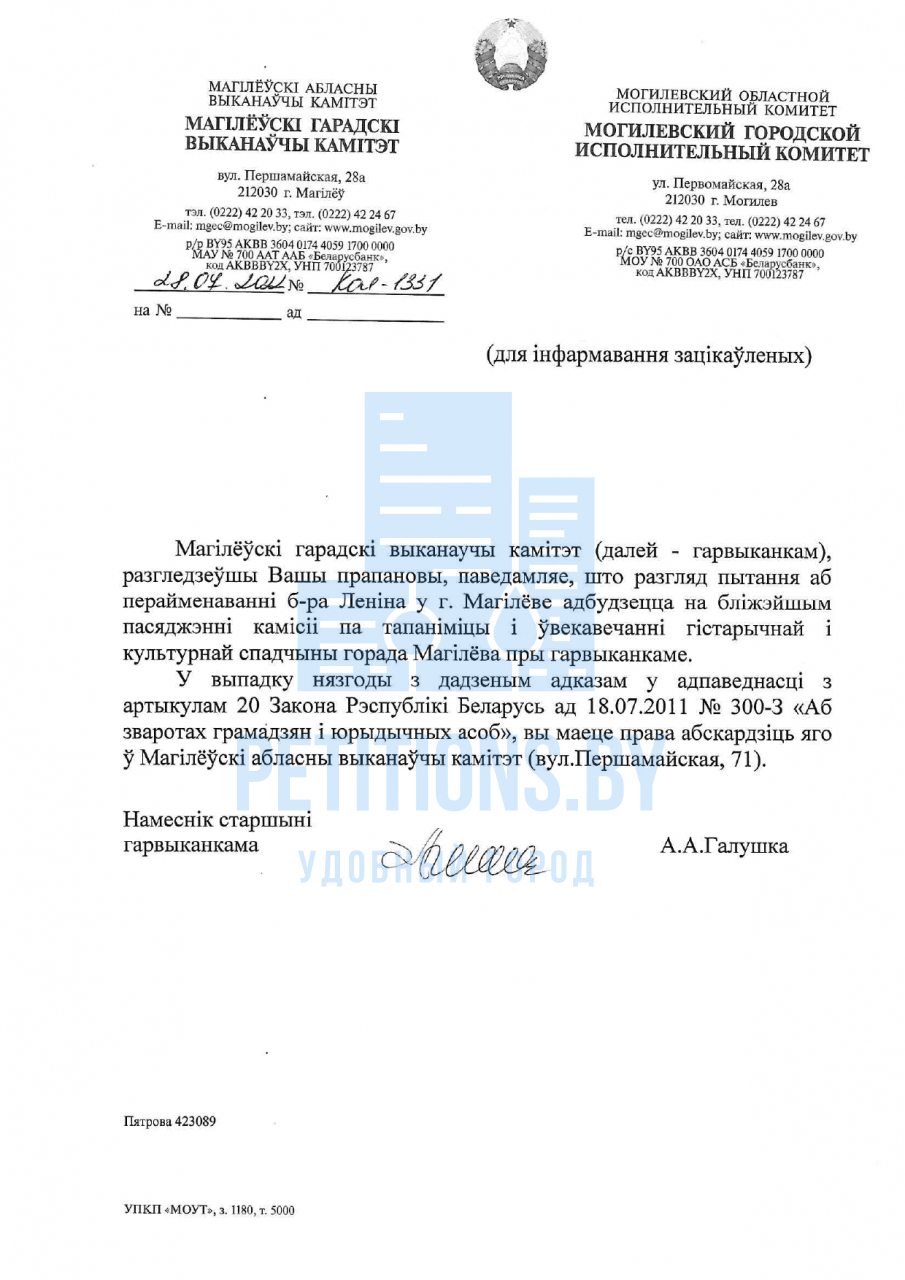 Па выніках разгляду камісія прыняла рашэнне адхіліць Вашу прапанову аб перайменаванні бульвара Леніна у г.Магілёве.
