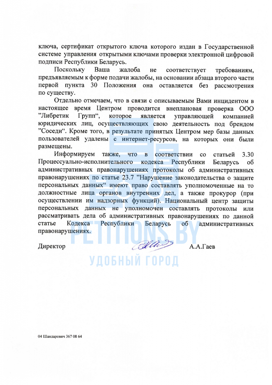 В настоящее время Национальным центром защиты персональных данных проводится внеплановая проверка ООО "Либертик Групп" (управляющая компания, владеющая брендом "Соседи"). В результате принятых Центром мер базы данных пользователей удалены с интернет-ресурсов, на которых они были размещены.